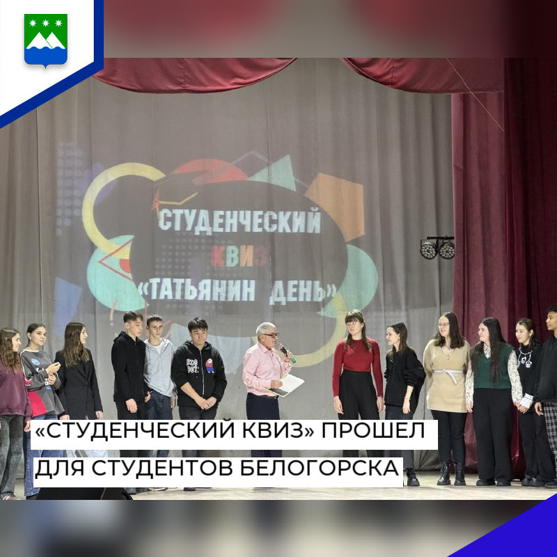 Накануне Дня российского студенчества в Доме культуры «Амурсельмаш» Белогорска состоялся студенческий квиз «Татьянин день». Он прошел 23 января для студентов Амурского многофункционального центра профессиональных квалификаций и Амурского колледжа сервиса и торговли. Гостями мероприятия стали председатель горсовета Белогорска Виктория Гратий, исполнительный секретарь местного отделения партии «Единая Россия» Юлия Василенко. — Развлекательная программа была насыщена интересными конкурсами, весёлыми играми и концертными номерами, — рассказала директор ДК «Амурсельмаш» Маргарита Терещенко. — Самым активным студентам были вручены сладкие призы, С теплыми словами и поздравлением с предстоящим праздником перед ребятами выступила Виктория Гратий. Она вручила грамоты особо отличившимся в учёбе и общественной жизни студентам. Также студентам вручены грамоты Комитета по образованию и делам молодёжи Белогорска.