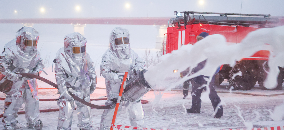 Автор: Анастасия Ковалёва, фото: Наталья Вольвач, 89.mchs.gov.ru 14 января колонна спецтехники пересекла границу Ямала, а 17 января «Безопасную Арктику» встретил Пуровский район. Программа экспедиции включала учения, передачу частицы Вечного огня, социальные и образовательные мероприятия. Основные события развернулись в посёлке Уренгое. В 8 утра на реке Пур, рядом с Пуровским мостом, десятки спасателей отработали действия при возникновении происшествий и чрезвычайных ситуаций. На учебных точках, а их в Уренгое было сразу две, проверку прошла и техника специального назначения. Условия действительно были экстремальными: мороз, ветер и снег - погодные условия добавили трудностей и в без того непростую задачу для сил и средств быстрого реагирования. Первое учебное задание - спасение человека из ледяной полыньи в результате ДТП. Команда «Ямалспаса» развернула надувное спасательное средство, вытащила пострадавшего и передала его медикам за считанные минуты. Второе задание - это локализаци