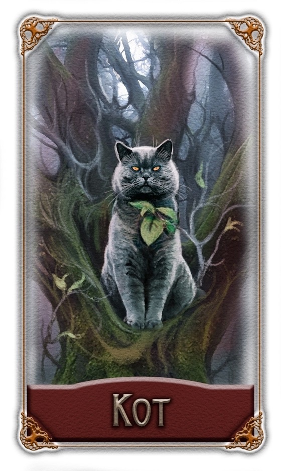 1. Кот. Общее описание. Кошка несет в себе множество значений, вращающихся вокруг баланса между, казалось бы, противоположностями, такими как внутреннее и внешнее, действие и покой, свет и тьма. Это сильно символизирует связь с тем, что обычно скрывается во тьме или неизвестности. Это самый первый тотем с чего я начала создание колоды. Почему Кот, а не Кошка? Ответ прост. Эта карта несет в себе энергию кота(мужское) и энергию кошки ( женское). На карте мы видим дымчатого котика, с прямым взглядом. Он немного самодоволен и высокомерен. Окружение достаточно мрачное и мистичное. Тем самым я хотела показать саму суть этой карты. Кот мистичен и может видеть тонкий мир. То что скрыто от глаза человека. Характеристика личности по этой карте. У такого человека гибкое тело, ему свойственны одновременно грациозность и спортивность. Характер его противоречив. У кошек своя внутренняя логика, а многие их решения кажутся нерациональными, и в какой-то степени так оно и есть.