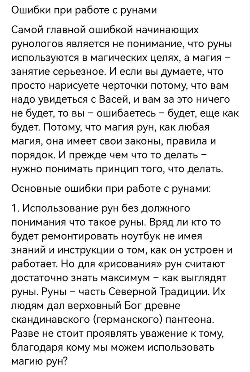 2 пункт. Правильно, это все серьезно. Но, блин, уравнивать руны и работу на кладбище и бесов, ну это слишком. Конечно, есть ставы для подключения к бесам, но по факту руны все же к черной магии не относятся. И не относились изначально. Это "свежие" умы начали использовать руны в негативных программах. Приводится в пример опять вызов человека, но так мы ни к богам не обращаемся, ни к бесам. Какие к черту кладбище и черти? Ну да ладно, в целом, есть о чем подумать.🤔