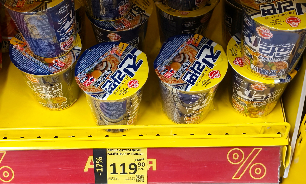 Всем привет! В Дикси щас проходит какая-то неделя корейской еды. Завезли лапшу, токпокки и др. Цены дешевле, чем на маркетплейсах. . По этому случаю я решил купить на дегустацию лапшу Оттоги за 119 р. Лапша Джин Рамён неострая. А какой тут вкус непонятно. На картинке нарисованы только овощи и грибы, возможно это грибной вкус. Баночка маленькая, 65 граммов. Изготовлена в Корее, в городе Пхёнтхэк. На упаковке состав очень тяжело прочитать. Пришлось даже фотографировать в макросъемке. Лапша тут пшеничная с огромным количеством добавок. Как бы это странно не звучало, но из специй тут только красный перец, черный перец, экстракт перца чили и чеснок. А на упаковке два раза написано , что это не острый вкус. В качестве растительной составляющей присутствуют пекинская капуста, сушёная морковь, сушеный зелёный лук, сушеные грибы, сушёная морская капуста и соевое мясо. В комплекте один пакетик специй и всё. Сухих овощей очень мало. Моркови, мяса и грибов вообще не видно. Завариваю клас