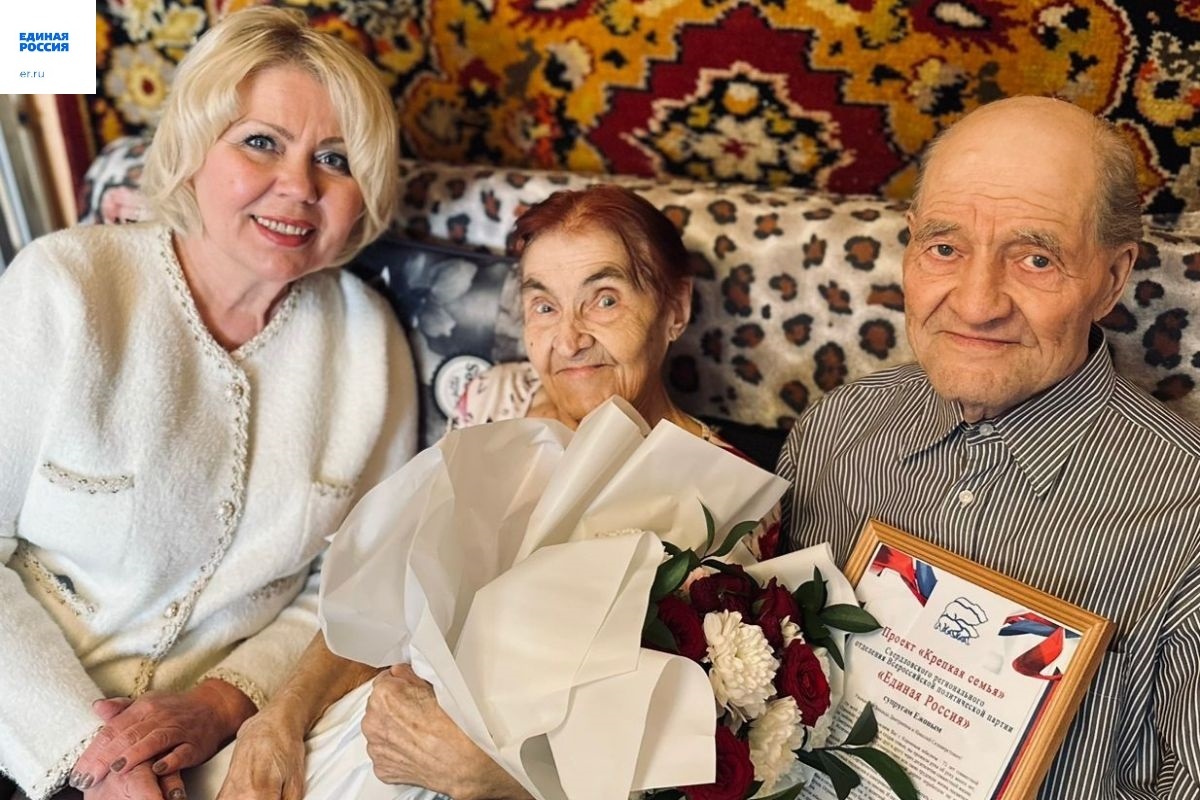 Председатель общественного совета партпроекта «Крепкая семья» Лилия Белоблоцкая поздравила чету Ежовых с 75-летием совместной жизни. Она вручила им благодарственное письмо координатора партпроекта «Крепкая семья» Евгения Шаповалова и памятные подарки.