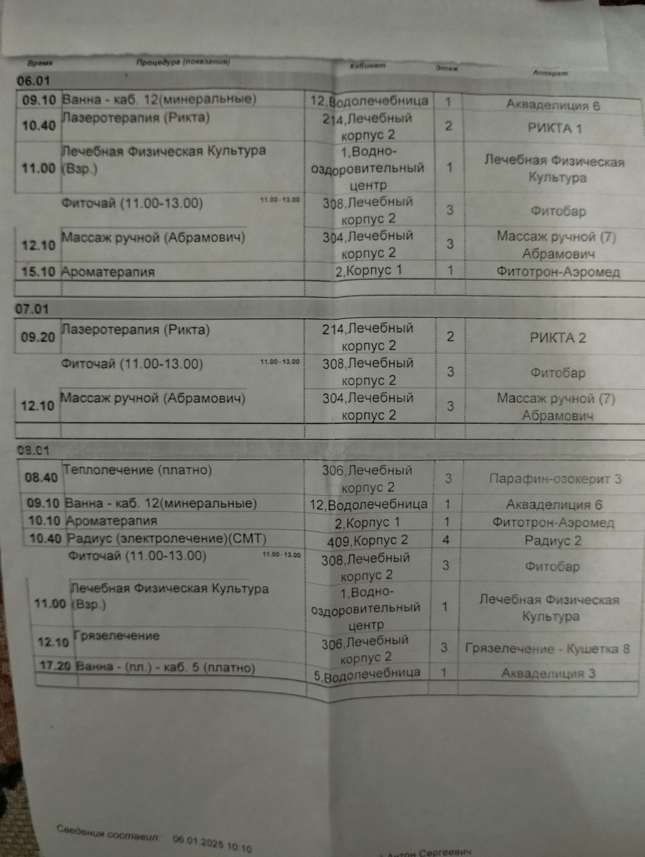 Для назначения процедур нужно посетить врача санатория. У врача есть график сколько и какие процедуры он может назначить в зависимости от количества дней пребывания в санатории и от диагноза, указанного в санаторной карте. День приезда и отъезда считается за один день. Приехав на 9 дней у нас получилось всего по 3 процедуры каждого вида. На руки выдают распечатку, где указано название процедуры, время и место проведения. Неудобно то, что все процедуры отпускаются не в одном корпусе, а в четырех -первый, второй корпус, отдельно здание водолечебницы и отдельно корпус с бассейном и залом ЛФК. В зимнее время постоянно приходиться одеваться, чтобы переходить из корпуса в корпус. Несколько дней у меня процедуры стояли так плотно по времени, что времени на завтрак просто не было. Я забегала на завтрак буквально на 10 минут и при этом опаздывала на процедуру. Вот такие процедуры мне назначили для лечения опорно-двигательного аппарата. 1. Лечебные ванны - минеральные ванны. Садишься в ванну,