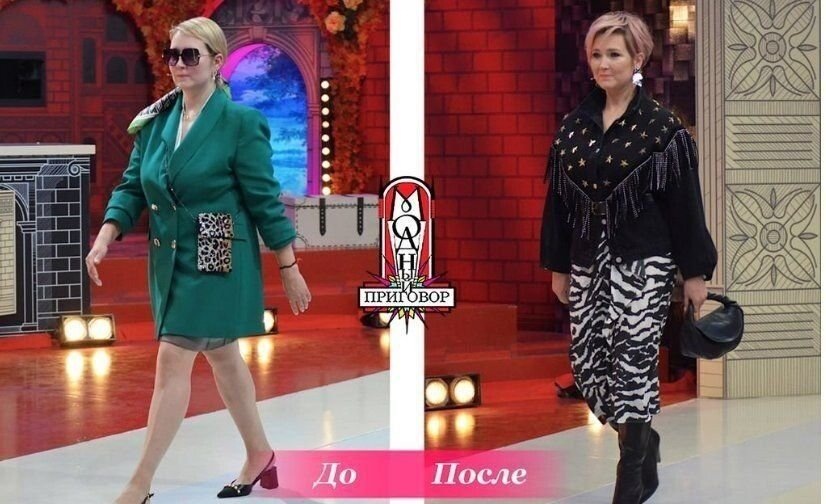 Образ "После" рассматривать сложно: пиджак просто не сел на фигуру, повиснув на участнице мешком. Никакой красоты и изящества, оценивать наряд сложно: пиджак большеват, брюки пошли складками — одежда просто не по размеру!