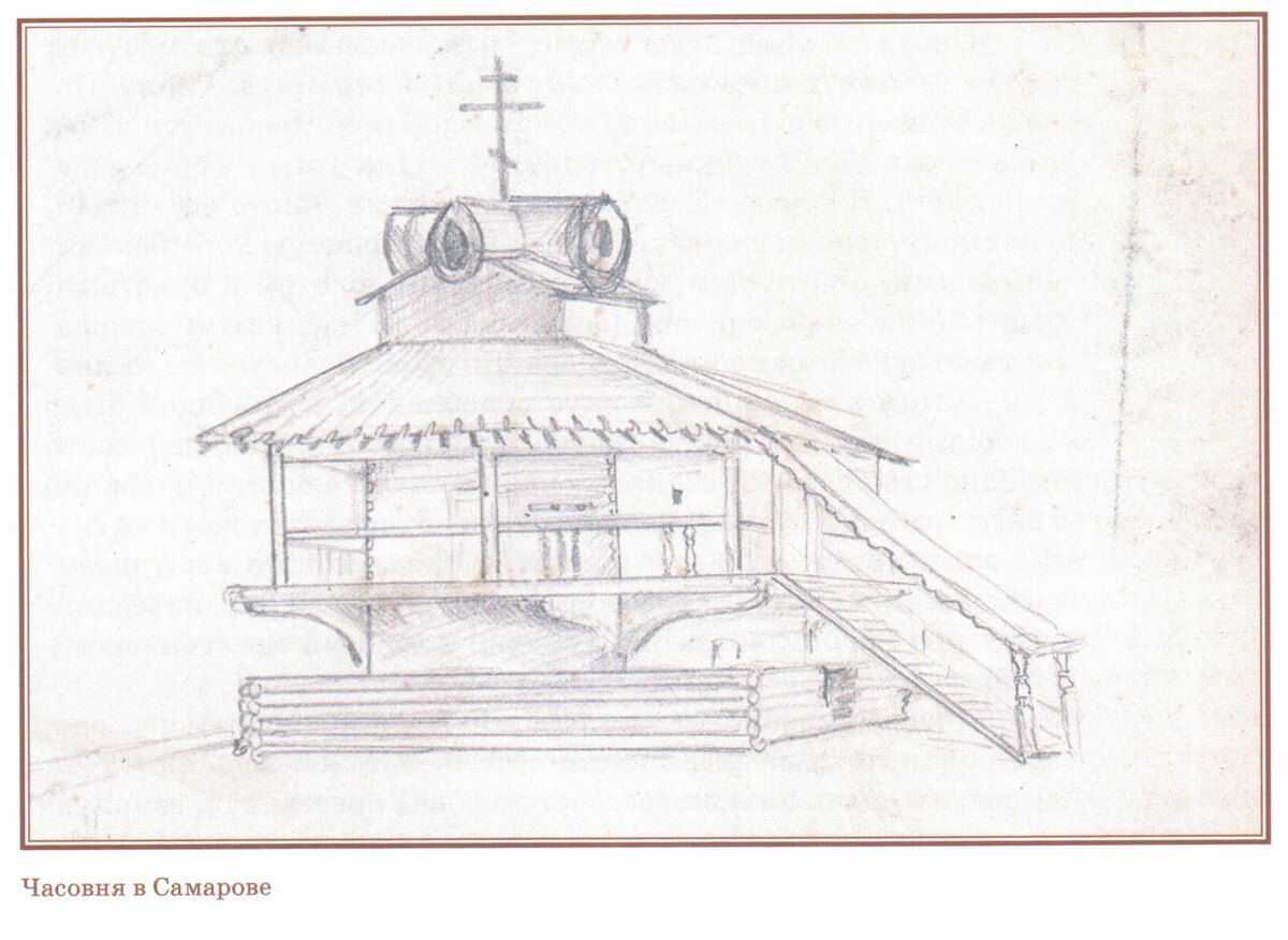 Хорошенький вид села Самарово у подножия горы сажен в 30, поросшей хвоей. Выдается на зеленом фоне новая каменная церковь. Несколько двухэтажных пестреньких домов придают ему оригинальный вид: по откосу горы тянутся огороды, на одном холме между развалившимися памятниками виднеется оригинальной архитектуры часовня. Во всем селе не встретили мы ни одной лошади; что они тут существуют, то это не подлежит никакому сомнению, но очень сомнительна возможность проезда на лошадях по ужасно узким улицам, по средине которых идет тротуар в две доски на 3 четверти выше топкого зеленоватого болота, на котором поместилось Самарово. Около этого села есть и золотые прииски. То есть хозяин нашего парохода с ревностью, достойной лучшей участи, стремится отыскать золото, для чего и платит ежегодно одному господину по 600 рублей. Сойдя с парохода, он прежде всего поспешил к своему доверенному, который тотчас же и удовлетворил его любознательности, вытащив из