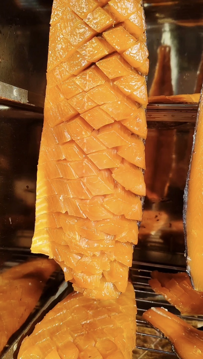 Лосось холодного копчения: изысканность вкуса и техника приготовления На этой фотографии перед нами великолепный пример лосося, обработанного в технике холодного копчения. Его характерная сетчатая нарезка — это не только эстетическое решение, но и важный этап в создании нежной текстуры и насыщенного аромата. Особенности холодного копчения Холодное копчение отличается от горячего своей температурой и продолжительностью. Процесс происходит при температуре 20–30 °C, что позволяет сохранить структуру рыбы и подчеркнуть её естественный вкус. Температура: Благодаря низкой температуре мясо остается сырым, но пропитывается ароматом дыма. Время: Процесс может занимать от 12 до 48 часов, в зависимости от размера филе. Текстура: Рыба становится мягкой, шелковистой и идеально подходит для нарезки тонкими ломтиками. Зачем нужна нарезка сеткой? На фотографии видно, что перед копчением филе нарезано сеткой. Это имеет свои преимущества: Равномерное копчение: Дым проникает глубже в рыбу чере