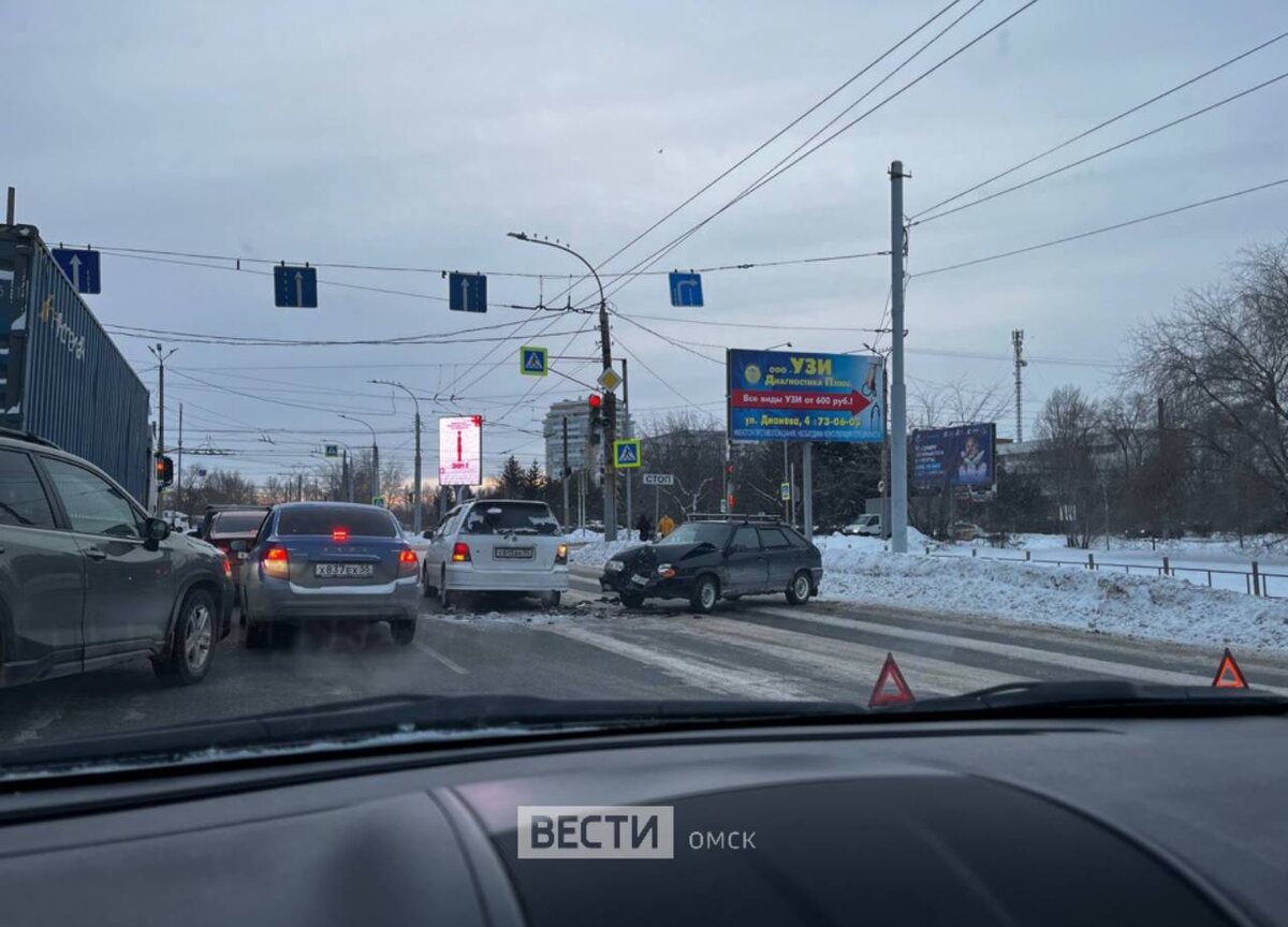 На перекрестке улицы Лукашевича с улицей Дианова столкнулись два легковых автомобиля. Из-за этого две полосы движения оказались заблокированы, и образовались пробки.