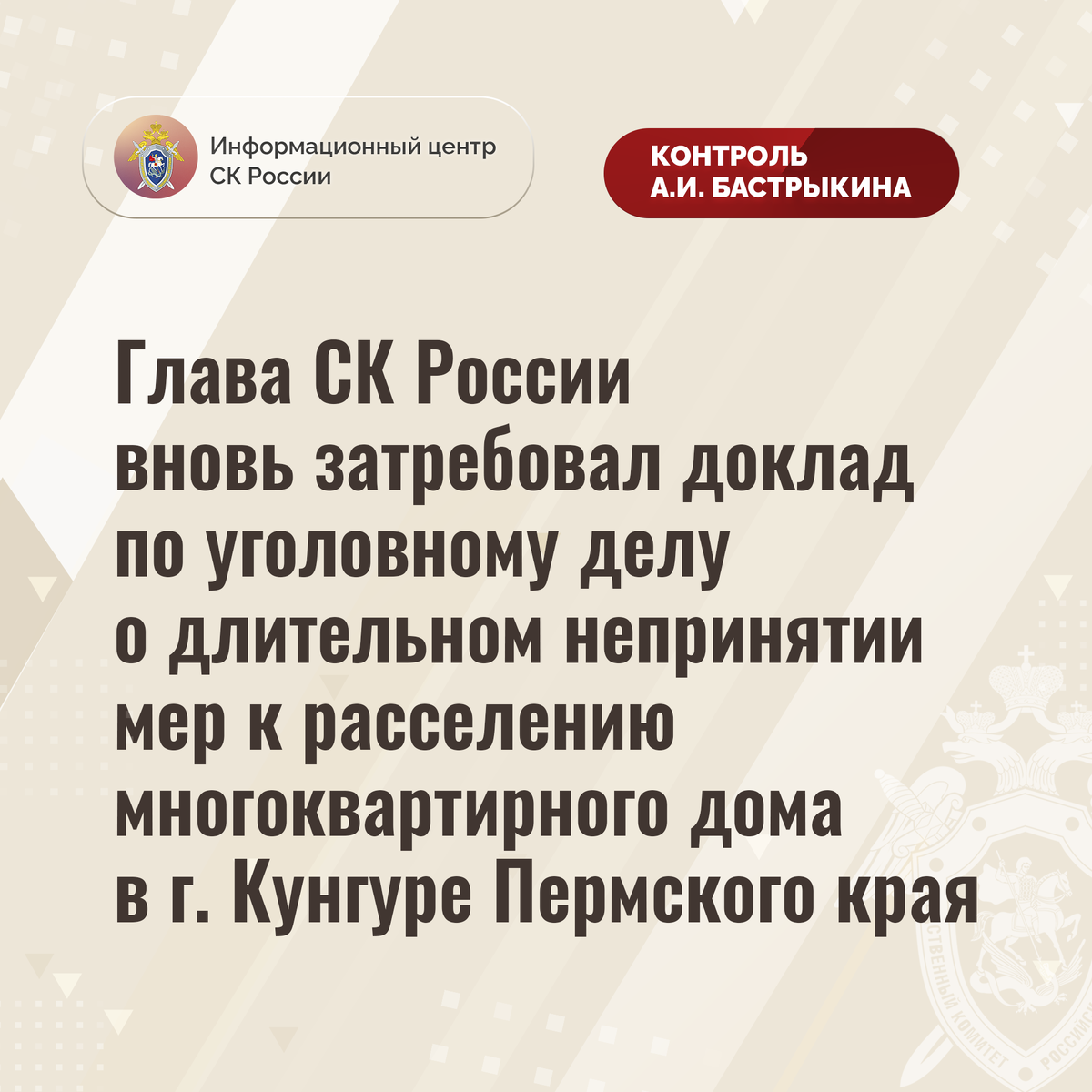 Глава СК России вновь затребовал доклад по уголовному делу о длительном непринятии мер к расселению многоквартирного дома в г. Кунгуре Пермского края В приёмную Председателя СК России А.И. Бастрыкина «ВКонтакте» вновь обратилась жительница Пермского края. Она выразила несогласие с ходом установления обстоятельств длительного нерасселения жильцов многоквартирного дома на улице Свободы в городе Кунгуре. В 2019 году здание, 1956 года постройки, из-за значительного износа конструкций признано аварийным и подлежащим сносу. Однако до настоящего времени собственники благоустроенными квартирами не обеспечены. При этом гражданам предлагают переселение в неблагоустроенные жилые помещения маневренного фонда или получение компенсационных выплат, размер которых не позволяет приобрести равнозначное недвижимое имущество. В результате одна часть жильцов продолжает проживать в небезопасных условиях, другая, опасаясь обрушения дома, вынужденно переехала в арендованные квартиры. Многочисленные обращения