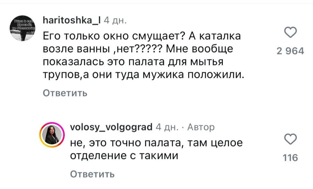 Более миллиона просмотров в инстаграме (который относится к компании Meta, признанной экстремистской и запрещенной на территории в РФ) набрало видео с загадочной планировкой палат в инфекционной больнице № 1 в Кировском районе Волгограда. На видео — одиночная палата с довольно современной кроватью, расположенной в небольшой нише. По центру стоит кушетка, у противоположной стены — ванна и раковина. В одной из стен палаты вмещено большое окно с крайне прозрачным стеклом и без намека на занавески. Получается, что свидетелем гигиенических процедур могут стать проходящие по коридору. Видео: @volosy_volgograd (инстаграм, относится к компании Meta, признанной экстремистской и запрещенной на территории в РФ) — Представляю вашему вниманию обзор на палату в инфекционной больнице города Волгограда в Кировском районе, — говорит автор видео. — Вот моя кровать, тут у меня туалет за закрытой дверью без замочка (ко мне, слава богу, туда никто не ломится). Мне сказали, что в палате в этой ванне я могу