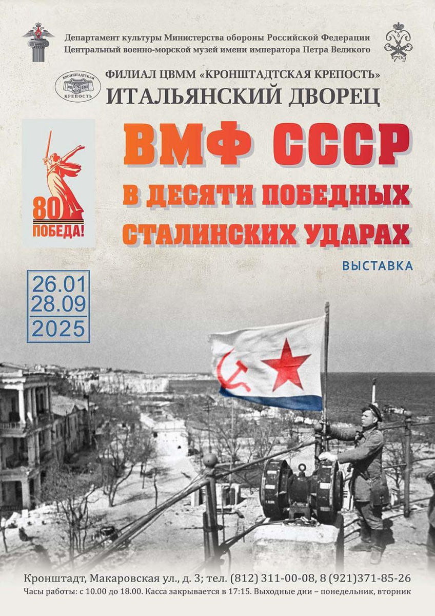 26 января в 15.00, в Итальянском дворце филиала «ЦВММ» «Кронштадтская крепость» состоится торжественное открытие выставки «Военно-морской флот СССР в десяти Победных Сталинских ударах».