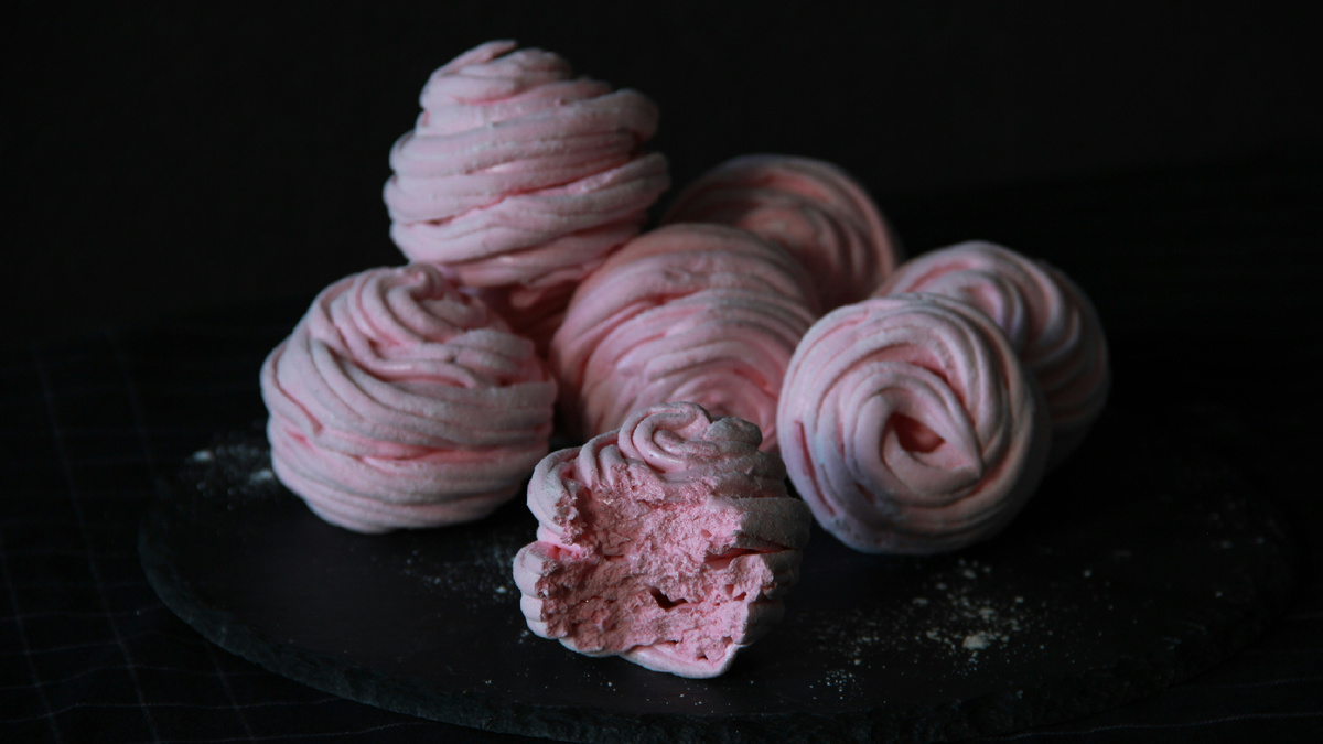 Клубничное пюре: Зефир: Чтобы приготовить клубничное пюре, возьмите кастрюлю среднего размера. Если у вас свежие ягоды, потушите их с 1 столовой ложкой сахара на среднем огне в течение 10-15 минут. Если же используете замороженные ягоды, время приготовления увеличивается до 25 минут. Пока ягоды тушатся, разомните их. Затем протрите смесь через сито, чтобы получить около 250 г пюре. Остудите пюре и уберите в холодильник. Лучше всего приготовить его за день до использования. Подготовьте необходимые инструменты: положите кондитерский мешок с насадкой в высокий стакан, чтобы было удобно наполнять его. Застелите два противня пергаментной бумагой или силиконовым ковриком. Для приготовления сахарного сиропа смешайте в кастрюле среднего размера 200 г сахара, агар-агар и воду. Хорошо перемешайте и готовьте на среднем огне при температуре 115 °C около 10 минут. Когда температура сахарного сиропа достигнет 95°С, приступайте к приготовлению меренги. Возьмите миску и насадку для взбивания, в этой п