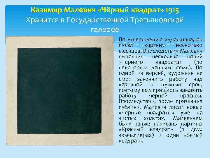 Выскажу свое мнение о нашумевшем произведении. Вряд ли есть такой человек, который не слышал о Малевиче. Она на слуху, ее часто обсуждают, возмущаются, ищут некий глубокий смысл и т.д. Скажу честно – эта картина меня никак не интересовала и не интересует. Когда в первый раз услышал о ней никаких эмоций она у мен не вызвала. Ну нарисовал, ну замазал неудавшийся холст, с кем не бывает. Никогда не вникал в тайный философский смысл этого шедевра. О картине вспомнил, когда мой руководитель – Владимир Васильевич дал мне напутствие. Когда в очередной раз Владимир Васильевич посмотрел на мою картину, он высказал: – Убери черный цвет. Совсем. Выбрось черный тюбик. Смешивай краски, что хочешь делай, используй темно-коричневый, создавай ощущение черного цвета любыми приемами, но без черной краски как таковой. Природа не любит черный. Там его нет. Везде есть оттенки. С тех пор я так и сделал и каждый раз вспоминаю совет Владимира Васильевича. Что касается «Черного квадрата» – разумеется, там живоп