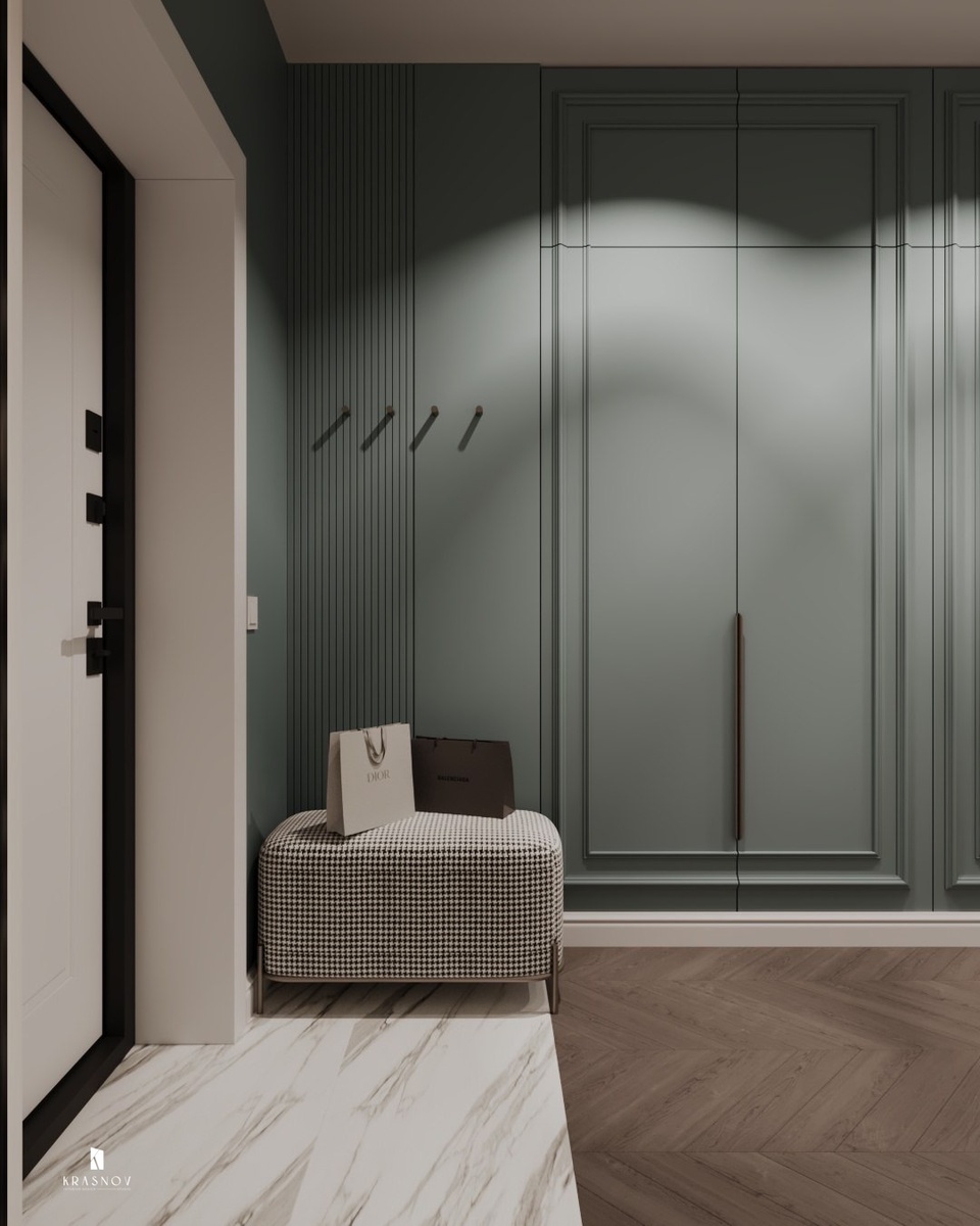 Продолжаю делиться с вами интерьерами элегантной квартиры в жк Upoint и на очереди у нас прихожая. Пространство, в котором хочется находиться, задает тон всей квартире . Мягкие нейтральные оттенки стен и паркета создают атмосферу спокойствия и уюта, а изящные молдинги и банкетка в «гусиную лапку» добавляют элегантности. Шкафы зеленого оттенка гармонично вписываются в общую палитру. Вертикальные рейки на стенах тонко подчёркивают архитектуру пространства. А точечное освещение выделяет текстуру и создаёт игру света. А как вам такой дизайн? Хотели бы видеть такую прихожую у себя? Делитесь мнением! Больше пользы и классных интерьеров в Телеграм канале студии krasnov_d - https://t.me/+XuhDDI9cYlo4MjIy