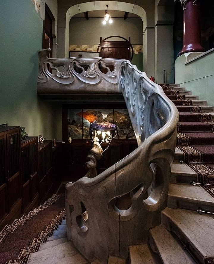Находится в особняке банкира и предпринимателя Рябушинского. Дом построен Фёдором Шехтелем в 1902 году. При его создании архитектор не был ограничен ни в средствах, ни в проявлении фантазии. Поэтому получилось что-то невероятное... Модерн в особняке всё-таки перекликается с модными тенденциями европейского ар-нуво — стиля, который характеризуется использованием в интерьерах естественных плавных изгибов, а не прямых линий и четких углов. Только посмотрите на лестницу! Мраморная лестница-волна — просто божественна! Лампа у её основания — загадочная морская медуза, на полу — инкрустация в виде волны. Если смотреть на медузу сверху, то она превращается в черепаху. Интерьер насыщен деталями-символами и природными мотивами. В каждой комнате свой рисунок дверей и дверных ручек, оконных рам, паркета, своя потолочная лепнина. В особняке есть тайная старообрядческая молельня (Рябушинские были старообрядцами), но старообрядчество преследовалось до принятия Указов о веротерпимости в 1905—1906 год