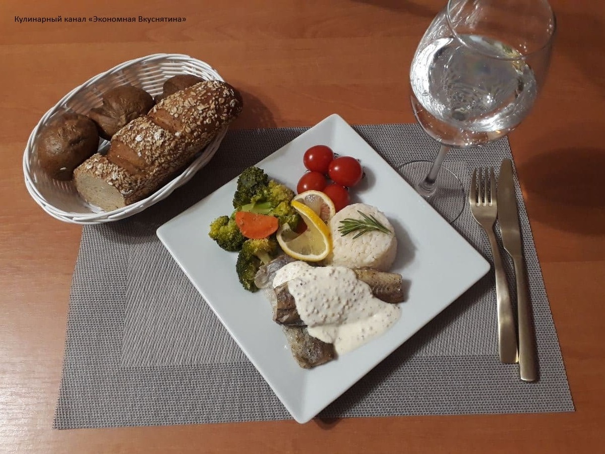 Экономно-простое блюдо Кулинарный канал «Экономная Вкуснятина» Когда не хочется проводить много времени вам поможет этот рецепт: сочная, запечённая филе минтая с нежным пикантным сливочно-горчичным соусом. Блюдо очень простое и очень вкусное! Для приготовления понадобится: 1. Филе минтая -500 гр. (3 шт. рыбы) 2. 1 ст. ложка специй для рыбы (без горки) 3. 1 ст. ложка растительного масла 4. 2 ст. ложки горчицы в зернах 5. 1 стакан 20% сливок Процесс приготовления: - Обмазываем специями филе рыбы минтая - В подготовленный противень выкладываем филе рыбы на пергаментную бумагу и смазываем растительным маслом - Отправляем противень с рыбой в духовку на 15 минут при температуре 180 градусов - Пока рыба запекается в духовке займемся соусом, для этого выливаем сливки в разогретую сковородку и увариваем до состояния жидкой сметаны - В загустевшие сливки добавляем горчицу и провариваем еще 1 минуту - Рыба готова, соус готов, приступаем к сервировке блюда - Сервируем блюда отварны