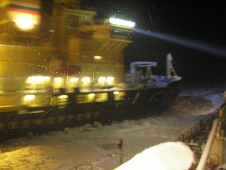 Танкер ещё сильнее стал набирать ход. Впереди показались огни быстро приближающегося ледокола. Стоящий рядом со мной рулевой, вдруг, попятился назад.
