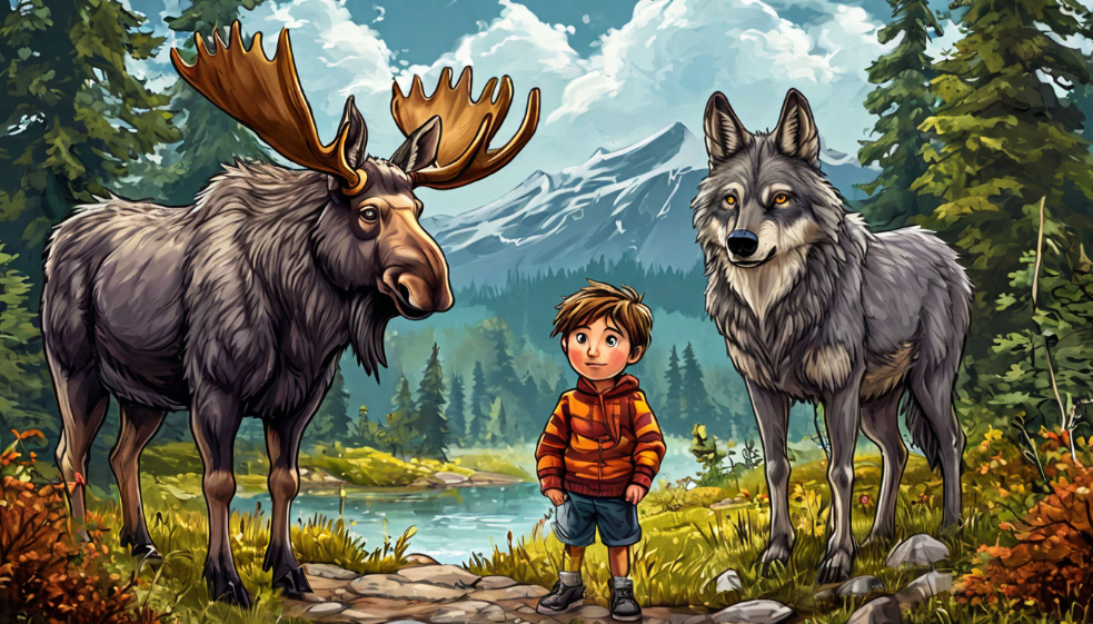 На опушке старого леса, где высокие сосны шептали вековые тайны, а берёзки, словно юные девы, кокетливо красовались в своих белых платьях, жил маленький мальчик по имени Тимофей. Он был любопытным и смелым, любил бродить по лесу, изучая каждый уголок. И вот однажды во время своей очередной вылазки Тимофей наткнулся на нечто странное и ужасное. – Ой! – воскликнул Тимофей, остановившись как вкопанный. – Что это там такое? В густых зарослях, между корявыми корнями старого дуба, он увидел огромного лося, попавшего в капкан. Капкан был поставлен на медведя, но, видимо, бедный лось угодил в него по ошибке. Лось был огромен, его могучее тело дрожало от боли и страха. Его рога, словно ветви дерева, запутались в траве, а полные отчаяния глаза смотрели на мальчика. – Бедняжка, – прошептал Тимофей, подбежав ближе. – Сейчас я тебе помогу! И Тимофей без колебаний принялся за дело. Он был маленьким и слабым, но его сердце было полно решимости. Он пытался разжать капкан руками, но это было бесполезно