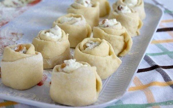 Булочки "Розочки" с творогом😍 Это красивая и вкусная выпечка. Ингредиенты: -Молоко — 250 мл -Яйца (2 в тесто, 1 в начинку) — 3 шт -Сахар (100 г в тесто, 100 г в начинку) — 200 г -Слив. масло (или маргарин) — 100 г -Мука (приблизительно) — 600-700 г -Ванильный сахар (1 пакетик в тесто,1 в творог) — 2 пакет. -Дрожжи (свежие или сухие 2 ч.л.) — 25 г -Творог — 500 г -Изюм — 100-150 г -Цедра лимона (по желанию, в тесто) -Соль (неполная) — 1 ч. л. Приготовление: Первым делом зальем изюм кипятком Теперь делаем опару. Подогреем молоко, перельем в миску. Добавим в молоко дрожжи ...сахар ...и примерно половину муки (лучше стакан, чтобы опара не была такая густая) Размешаем и поставим в теплое место подходить Готовим сдобу: Растопим масло, немного остудим Добавим в масло яйца ...сахар ...ванилин ...соль. Перемешаем. Опара подошла. Добавляем в опару сдобу Перемешиваем Понемногу добавляем оставшуюся муку ...и вымешиваем довольно таки крутое тесто. Ставим его в теплое место для подъема Готовим на