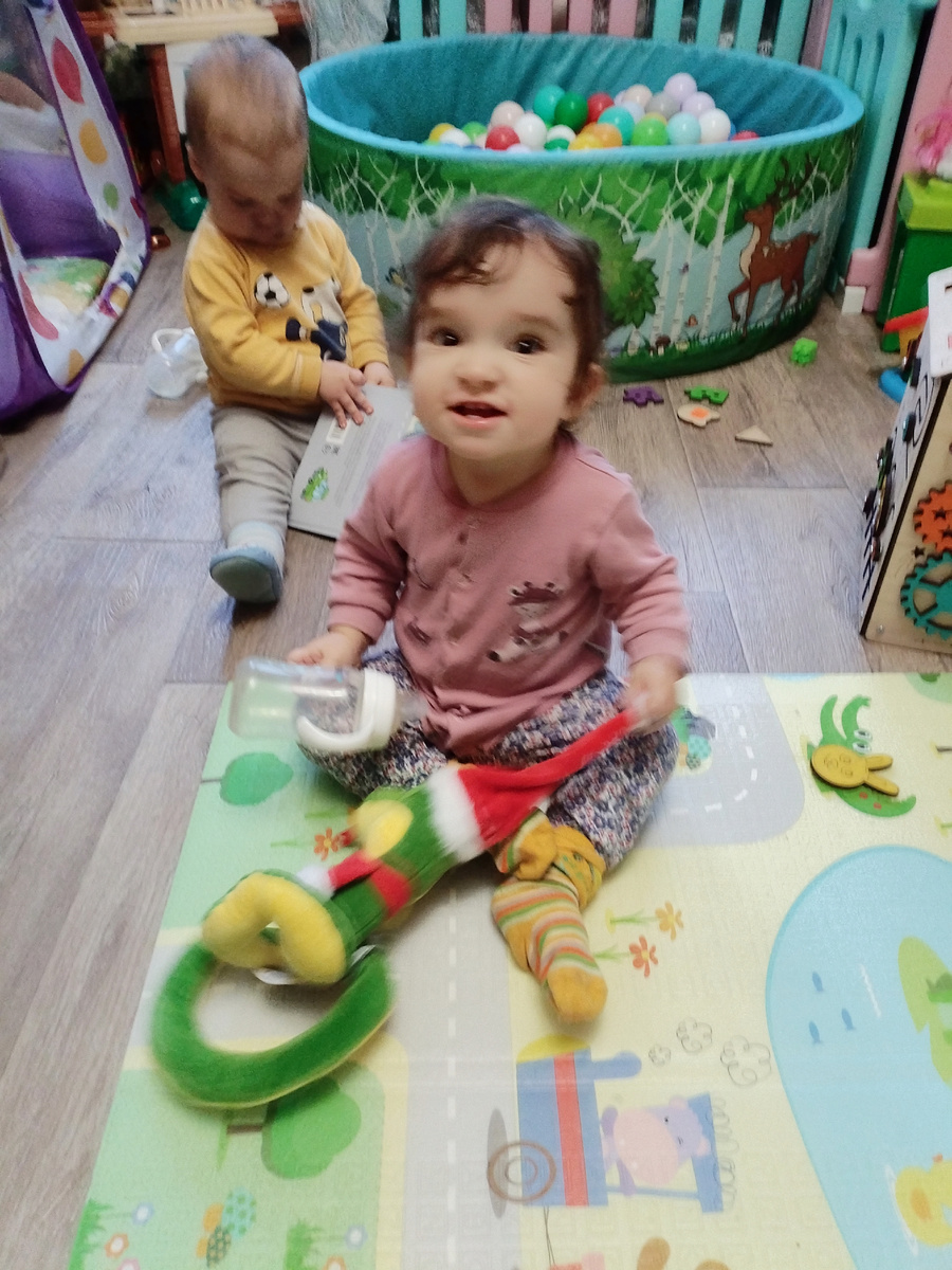 Зато мяч гоняем теперь каждый день. Тоже неплохо. А то лежал невостребованный. Хорошо получается у малышей и об пол ударять мяч, и в руки кидать. Точно, конечно, не попадают. Все впереди.