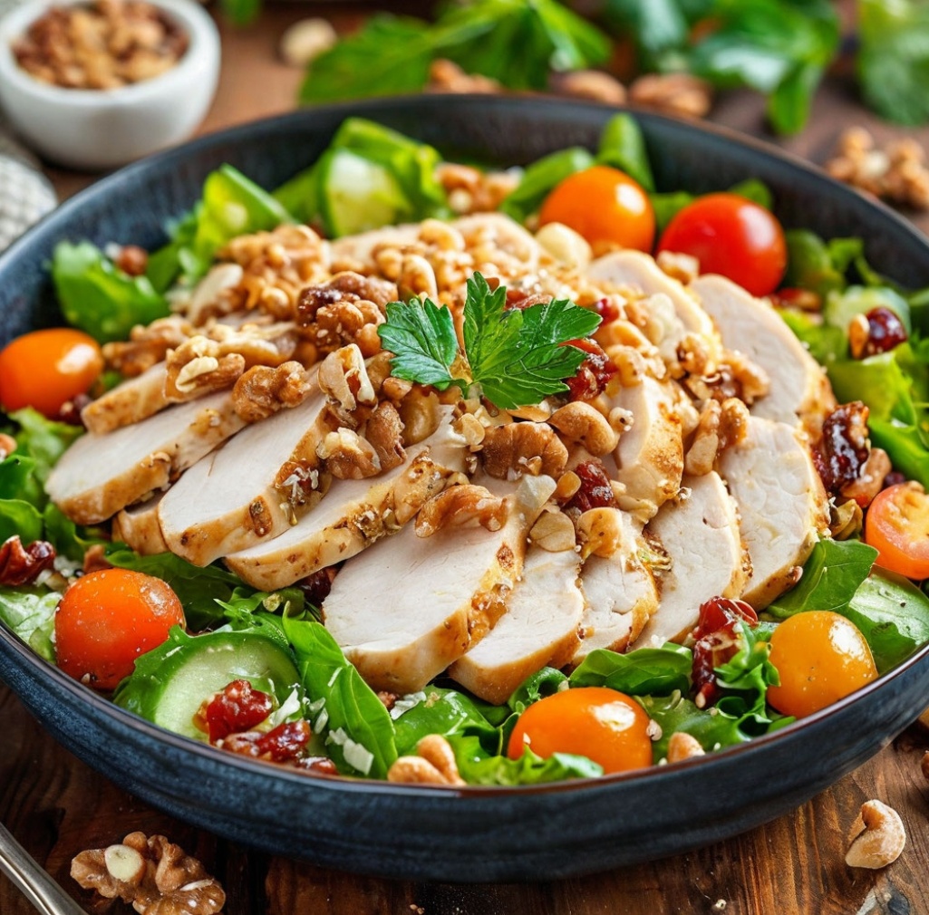 Описание: Салат готовится из куриной грудки, свежих овощей и грецких орехов. Он отличается нежным вкусом и хрустящей текстурой, а также ярким ароматом благодаря специям. Этот салат идеально подходит для тех, кто следит за своим здоровьем, но не хочет отказываться от вкусной еды. Куриное мясо — источник белка, который необходим для роста и восстановления мышц. Овощи богаты витаминами, минералами и антиоксидантами, которые улучшают обмен веществ и укрепляют иммунную систему. Грецкие орехи содержат полезные жиры, которые улучшают работу мозга и нервной системы. Салат также содержит специи, которые придают блюду яркий аромат и улучшают пищеварение. Этот салат — отличный выбор для тех, кто хочет питаться здоровой пищей, но не хочет ограничиваться в разнообразии вкусов. Он идеально подходит для обеда или ужина, а также может быть подан на праздничный стол. Если вам понравился рецепт, пожалуйста подпишитесь, и напишите своё мнение о данном блюде:)