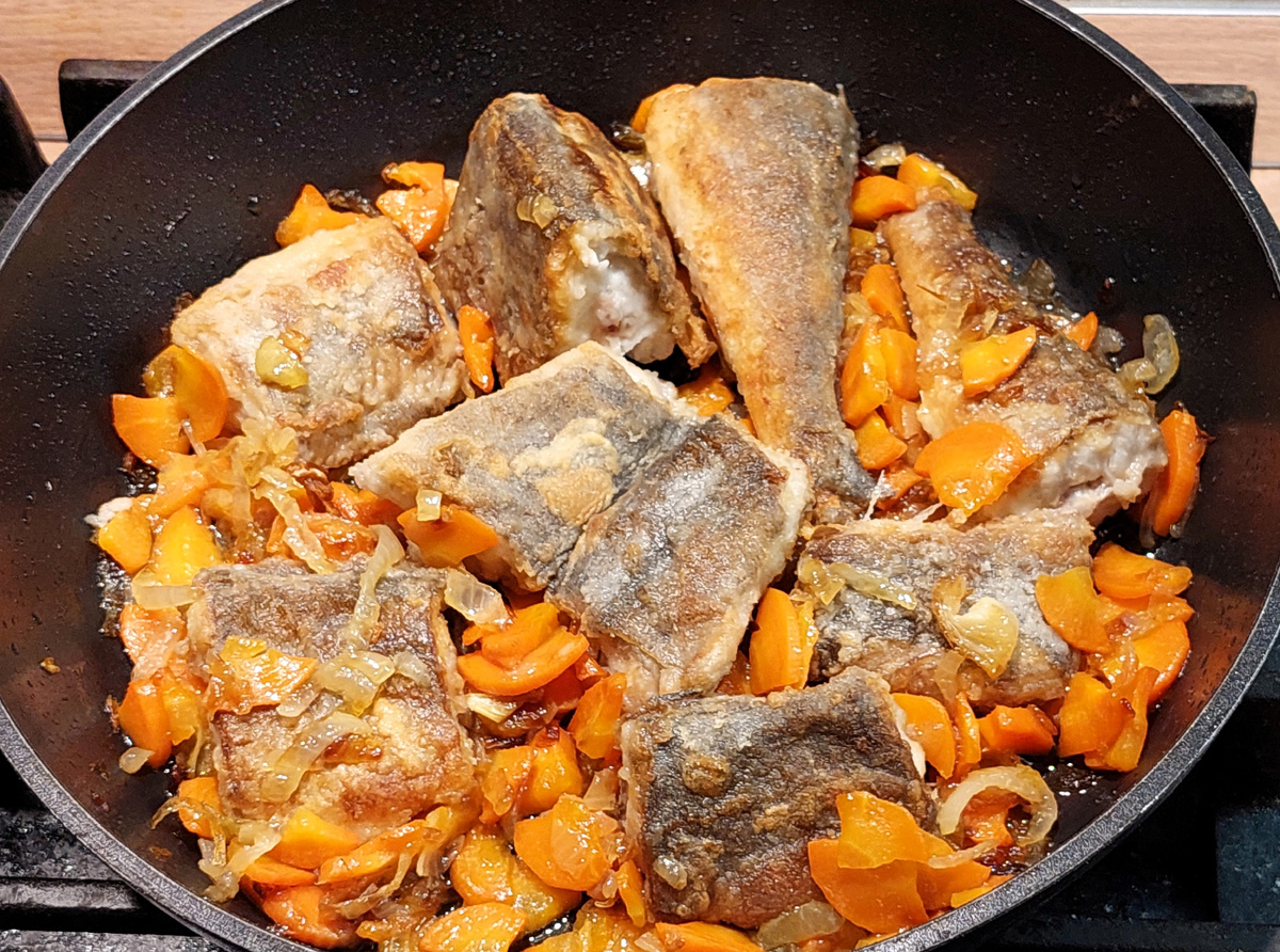 Давненько мы не готовили рыбу и решили сегодня приготовить на ужин терпуга, поджарить его и затем потушить в сметане на подушке из овощей! Чаще всего терпуг я жарю на сковороде самым простым способом, используя минимум приправ. Это одна из моих любимых рыб. Терпуг рыба очень вкусная, нежная и умеренно жирная. И, что не менее для меня важное, в ней очень мало костей. Всегда покупаю, когда встречаю рыбу Терпуг. Вот и на сей раз не устояла в магазине Светофор. И с виду рыбка выглядела неплохо и цена меня устроила. Выбрала в Светофоре 2 самые крупные рыбки, по цене 258 руб./кг. Прелесть терпуга в его божественном вкусе и в том, что не нужно долго возиться с чисткой рыбы, очищать ее от чешуи, а только выпотрошить. Итак, возьмите: Пошаговый рецепт. 1. Рыбку Терпуг - почистить внутренности, ополоснуть чистой водой, срезать плавники и порезать. У меня вышло 6 кусочков. 2. Посолила и поперчила. Оставляем так мариноваться рыбу на столе на некоторое время, минут 30. Рыба настолько вкусна сама п