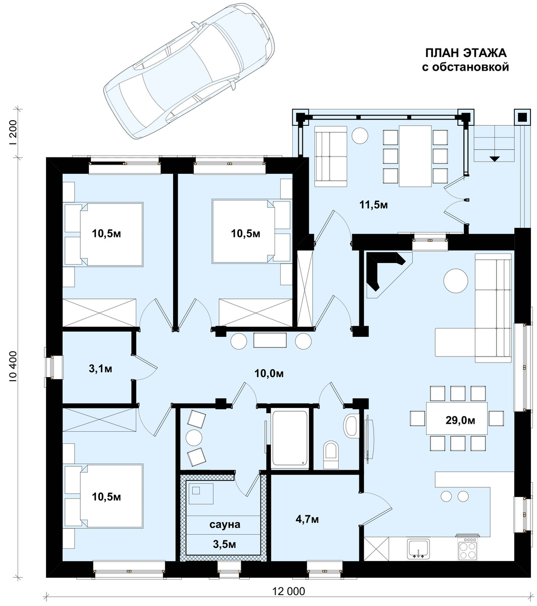 В прошлых постах рассматривали проекты домов 70-80 м2, 80-90 м2 и 90-100 м2, теперь ещё чуть увеличим рассматриваемый метраж. Сегодня представляем вам четыре проекта. Дом, площадь которого перевалила за сотню метров, из сегмента жилья "эконом" потихоньку выбирается, и движется к сегменту "бизнес", но ещё не достиг его. Маленько застрял посередине. Комфортно, красиво, без излишеств, но всё сугубо практично. Изучая планировки, обратите внимание, что все дома - с открытым планом без внутренних капитальных стен, положение перегородок можно немного менять. !! Все представленные проекты - готовые, заказать можно на нашем основном сайте. Ссылки на сайт в конце статьи и в статьях проектов. !! Простой дом 12х12 с вариантами планировки (листайте галерею), 2-4 спальни ✅ Проект дома готовый, предоставляется в кратчайший срок. Стоимость и порядок заказа чертежей - на основном сайте. Планировка одноэтажного дома с 2-3 спальнями, террасой и сауной, с вариантами планировки (листайте галерею) ✅ Проект