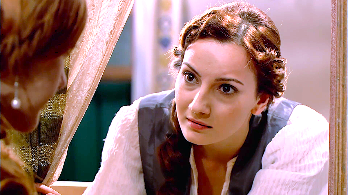 Мария уговаривает Хюррем признаться, что беременности нет. В гареме за такую ложь можно головы лишиться. Мария понимает, всё это не игрушки. Девушка искренне беспокоится за подругу. Интересно, какие у них там окошечки в коридоры. Мы привыкли к окнам на улицу. А в султанском дворце есть окна из комнат в коридоры. Возможно, в каких-то комнатах они заменяют окна на улицу. Обратите внимание, через такое окно Мария разговаривает с Хюррем. О чём же думает сама Хюррем? Надо заметить, Мария - единственный человек, которому Хюррем доверяет. Только ей Хюррем говорит правду, что никакой беременности нет. На данный момент Хюррем делится с Марией тем, что думает. А думает Хюррем, будто нет беременности, но есть любовь к Сулейману. И тут действительно ей веришь. Так проникновенно она об этом говорит. Сначала Хюррем тяжело вздыхает. Играет романтичная мелодия. Но вдруг настроение Хюррем становится боевым. Она говорит Марии, что не сможет пережить, если к ней прикоснётся кто-то другой. И Мария верит