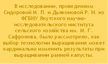Многие и не задумываются, как маленькие детали могут повлиять на большой урожай. В исследовании, проведенном Сидоровой М. П. и Дьяконовой Р. Н. из ФГБНУ Якутского научно-исследовательского института сельского хозяйства им. М. Г. Сафронова, было рассмотрено, как выбор технологии выращивания может кардинально изменить результаты при выращивании ранней капусты. В рамках эксперимента были сравняты два метода выращивания ранней белокочанной капусты: безгоршечный и кассетный. Результаты оказались удивительными. Безгоршечный способ выращивания рассады — это метод, при котором растения выращиваются без использования горшков или контейнеров. Вместо этого семена или рассада развиваются в специальных системах, таких как грядки. Кассетный способ рассады — это метод выращивания растений, при котором семена или молодые растения высаживаются в специальные кассеты с ячейками. В каждой ячейке находится отдельный корень, что позволяет растениям развиваться в оптимальных условиях, не мешая друг другу.
