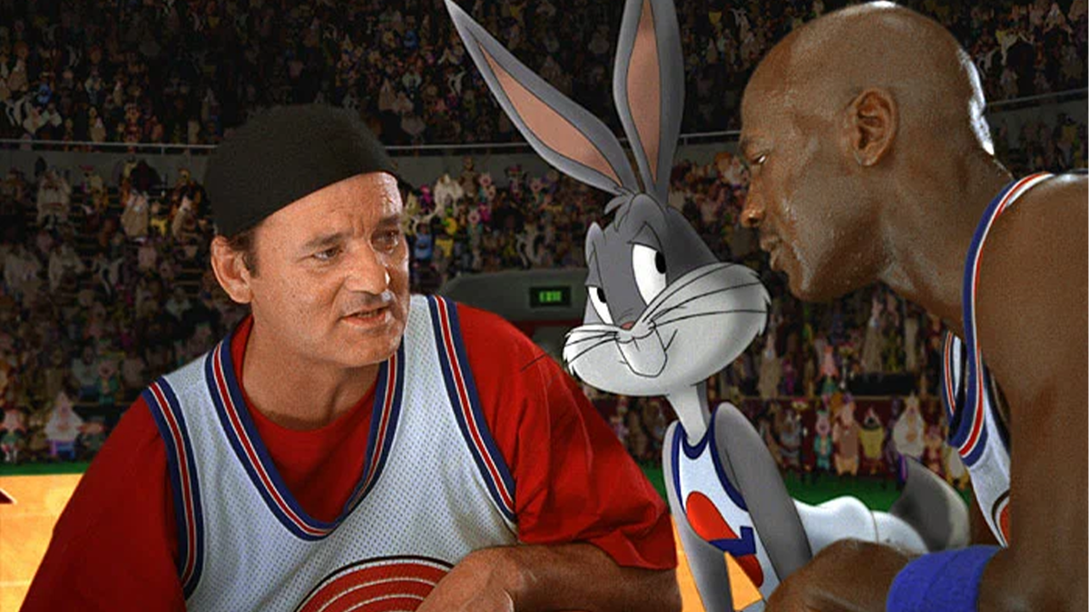 Открывает десятку гибрид кино с анимацией «Космический джем». Его созданию поспособствовало два рекламных ролика Nike с участием Майкла Джордана и Багза Банни. После того как ролики стали популярными, креативный директор Wieden+Kennedy Джим Рисуолд решил раскручивать идею дальше и создать бренд «Hare Jordan». Он даже поручил Джо Питке снять рекламный ролик «Hare Jordan», на что было потрачено 1 млн$ и 6 месяцев. Но студии Warner Bros. не понравилось, что его персонажа собирается монетизировать Nike, и сама решила это сделать, дав добро на создание фильма с Майклом Джорданом и Багзом Банни. История же простая. Есть Майкл Джордан, который объявил, что уходит из баскетбола, чтобы заняться бейсболом, и есть персонажи Looney Tunes, подвергающиеся нападению со стороны инопланетных захватчиков. Дабы решить спор, Багз предлагает сыграть баскетбольный матч, и чтобы повысить шансы на победу мультяшки похищают Майкла Джордана.