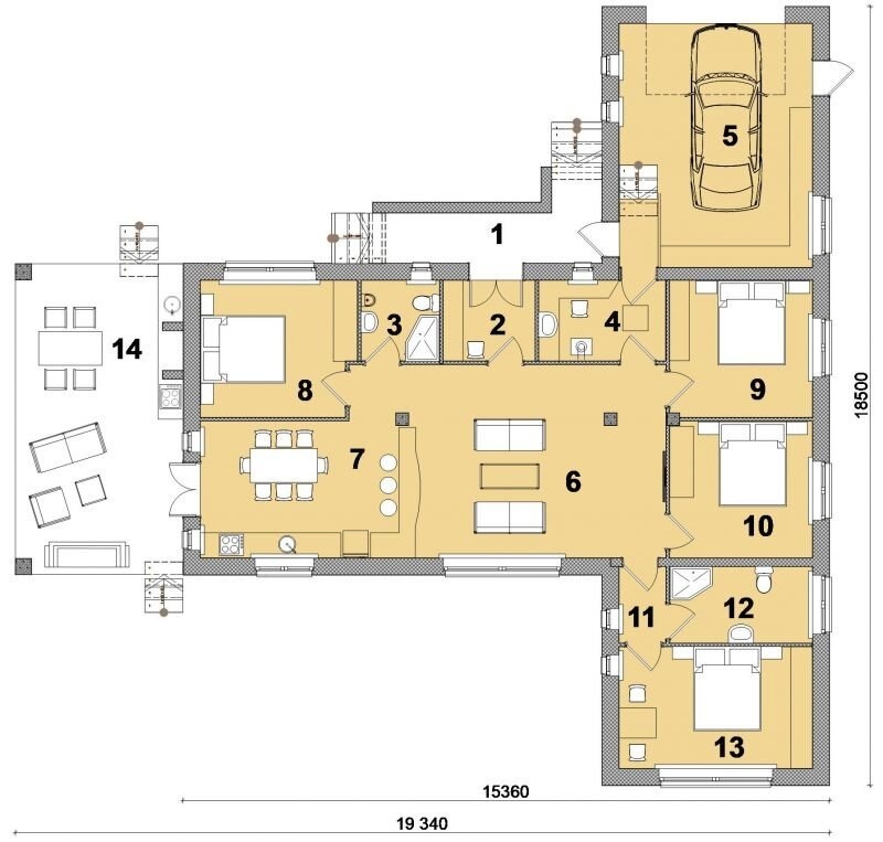 В прошлой публикации рассматривали дома до 140 м2, теперь ещё чуть больше. Одноэтажные дома 140-150 м² идеально подходят для тех, кто ищет золотую середину между компактностью и свободой. Они предлагают достаточно места для жизни, избегая избыточности больших особняков и тесноты маленьких домов. В состав помещений обычно входят: - 3-4 спальни (включая главную с гардеробом), в тихой зоне, часто с выходом в сад или во двор. Спальни обычно поделены на жилы группы, 2+2 или 2+1; - совмещенная гостиная; - 2-3 санузла (гостевой и совмещенный с хозяйским блоком); - входная зона с тамбуром и кладовой; - технические помещения (котельная, прачечная). Также эта площадь позволяет расположить и гараж. Но всё же для гаража более подходят дома побольше, от 160 метров. Здесь, как обычно, показываем только планировки. Подробности заинтересовавшего проекта можно изучить, перейдя по ссылке на соответствующую статью. !! Все представленные проекты - готовые. Заказать документацию можно на нашем основном са