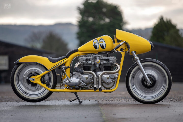 Mooneyes — это не только бренд, ассоциирующийся с престижной выставкой кастомных мотоциклов и автомобилей в Японии, но и компания с богатой историей, уходящей корнями в 1950-е годы в Америке. Основатель бренда, Дин Мун, стал известен благодаря своим творениям в мире хот-родов в Южной Калифорнии. Одним из его самых ярких проектов стал Mooneyes Streamliner — гоночный автомобиль с футуристичным дизайном, который вдохновил на создание уникального двухмоторного дрэг-байка. История Джеймса Роджерса, мастера, который воплотил в жизнь этот необычный проект, не менее удивительна. Джеймс, работающий гидроизолятором подвалов, в свободное время создаёт кастомные мотоциклы в своём гараже. Он не имеет инженерного образования, но его страсть к мотоциклам и желание создать что-то уникальное привели к созданию двухмоторного стримлайнера. Проект начался с двух повреждённых корпусов двигателей Triumph TR6, найденных в гараже. Затем Джеймс получил T120R с масляным картером, у которого шатун не подходил к