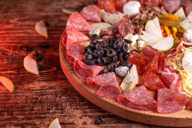 Мясные антипасти – рай для любителей итальянских колбас! Прошутто, салями, мортаделла и др. в виде элегантной нарезки никого не оставят равнодушным.