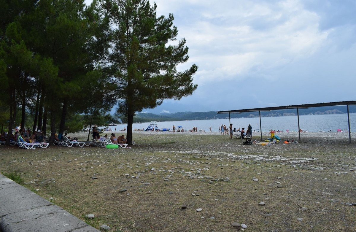 Пляж, на который мы ходили, был на территории бывших санаториев. Вход на него платный — 80 RUB. Платили только за взрослых. По талончикам можно было ходить туда и обратно несколько раз. Плавали слева от причала, больше всего там понравилось. Море спокойное, теплое. Погода в Пицунде умеренно теплая: днем не так жарко из-за бухты, вечером тоже тепло.