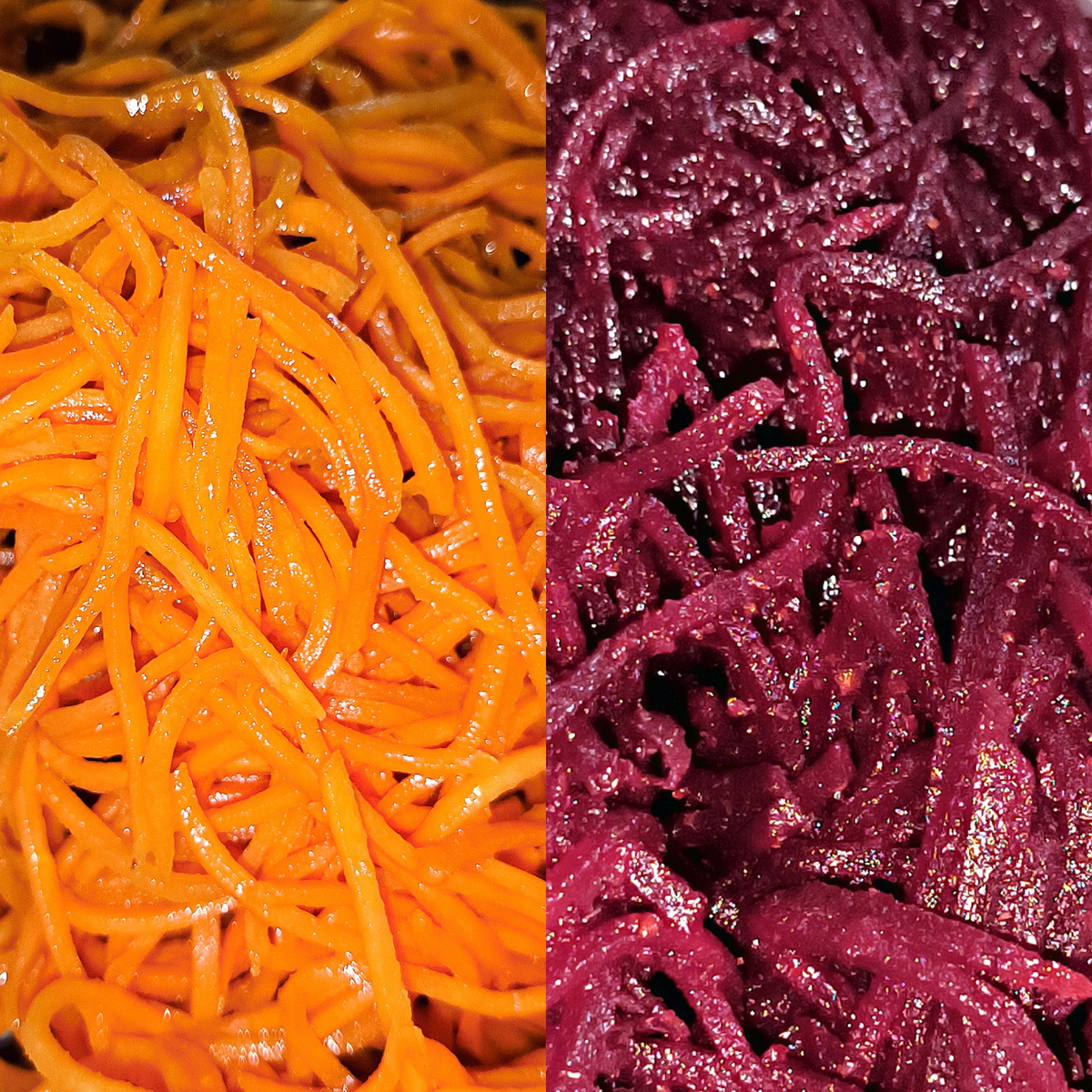 Приготовим сегодня салат для которого можно взять 2 ингредиента уже готовые - салат морковь по - корейски (морковчу) и такой же салат бурякчу (свеклу). Или можно приготовить все самим. Если будите брать готовые, то на салат понадобится по 300 гр и морковчи и бурякчи. Приготовим сегодня их сами. Берем две миски, в одну натираем морковь, а в другую свеклу. Натираем на тёрке для морковчи. Все специи будут одинаковые и для морковки и для свеклы. Ложим 1 столовую ложку сахара, чуть меньше половины чайной ложки соли. Пол чайной ложки кориандра, чуть меньше половины чайной ложки черного перца, 3 крупных зубчиков чеснока через пресс. В сковороде разогреем растительное масло сразу для двух мисок.Ставим на плиту сковороду в неё растительное масло около 100 мл и 3 столовые ложки уксуса 9%. Когда уксус будет закипать начинаем помешивать лопаткой или как делаю я, наклоняю сковороду с право на лево. Разогретое масло вливаю половину в морковь, а вторую половину в свеклу. Тщательно перемешиваем и ост