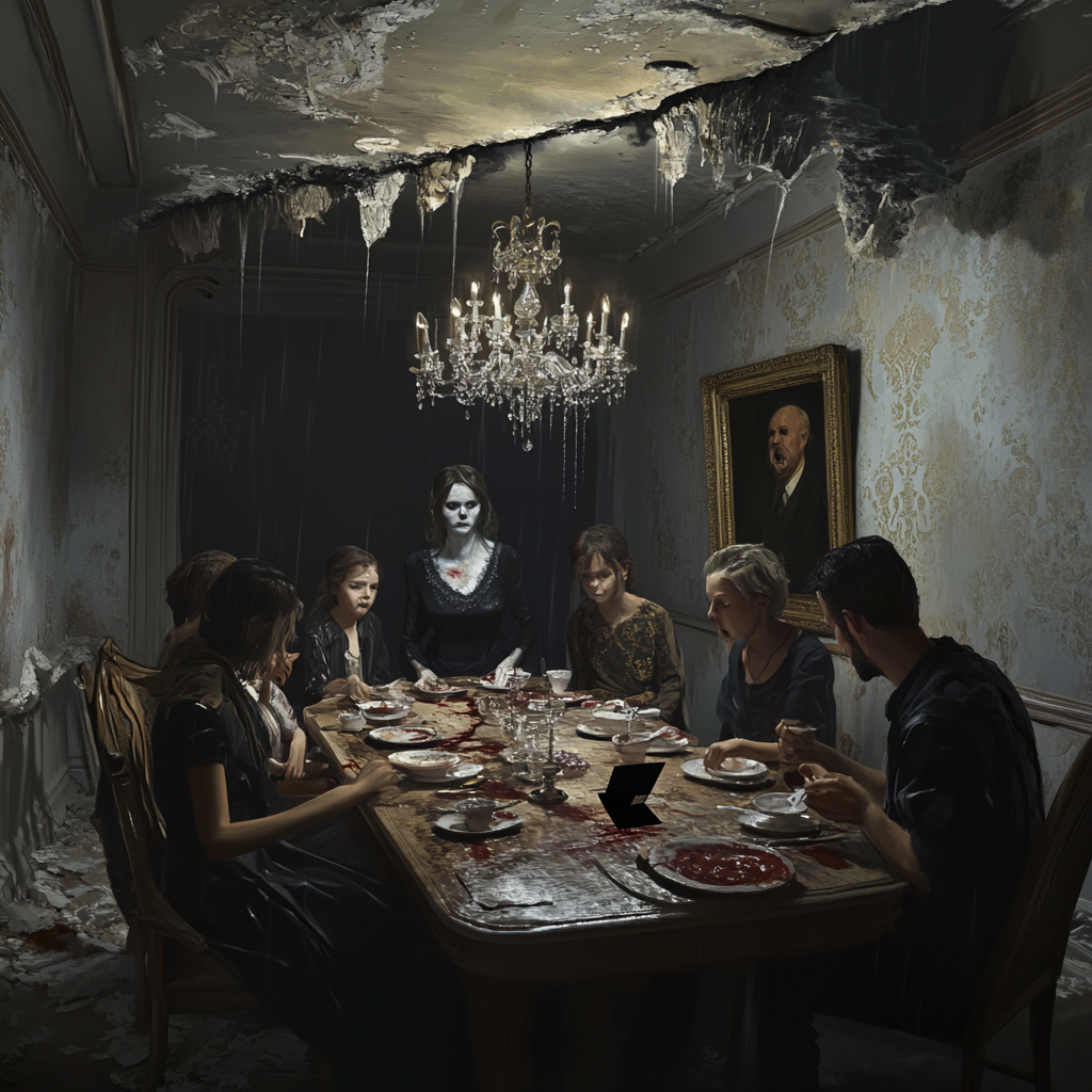 «Ваш отец...» — её голос сорвался, но тут треснула люстра. Осколки упали в суп Алёнки, окрасив бульон в розовый цвет от порезанной руки. Никто не двинулся помочь.