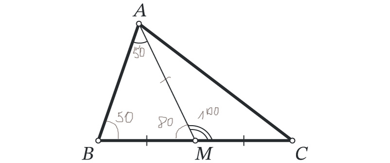 В треугольнике ABC проведена медиана AMAM. Известно, что ∠BAM=50∘, ∠AMC=100∘. Найдите углы треугольника ABC. В треугольнике АВМ легко вычислить углы. Угол М равен 80 градусов как смежный углу в 100 градусов. Угол В получается 180-80-50=50 И вот очень ловко вышло, что АВМ равнобедренный. Значит ВМ=АМ. А это значит, что медиана АМ равна половине ВС. Т.е. треугольник прямоугольный и прямость от угла А. Ответ: А=90, В=50, С=40 Другие задачи раздела
