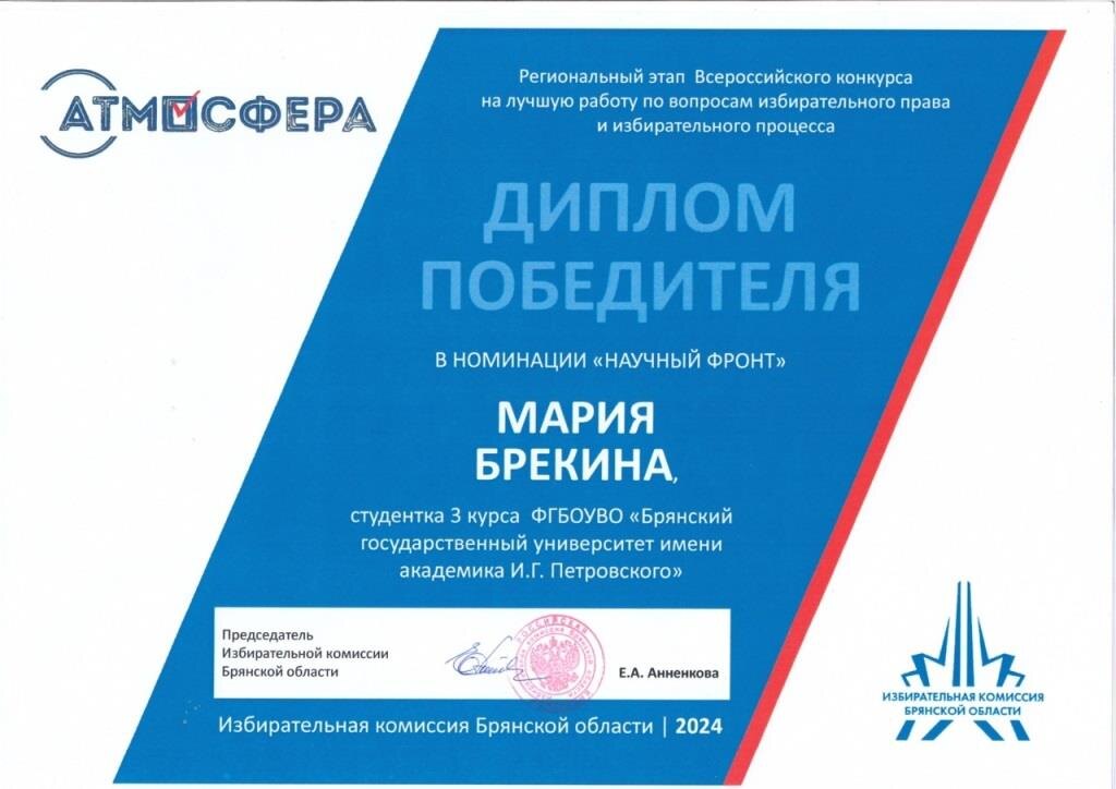 Определены имена участников федерального этапа Всероссийского конкурса «Атмосфера 2024–2025» на лучшую работу по вопросам избирательного права и избирательного процесса, организатором которого выступает Центральная избирательная комиссия Российской Федерации совместно с Минобрнауки России, Минпросвещения России, Федеральным агентством по делам молодежи. Мероприятие нацелено на повышение правовой и политической культуры молодых избирателей, организаторов выборов в органы государственной власти, органы местного самоуправления Российской Федерации и участников избирательных кампаний. Всероссийский конкурс «Атмосфера» проводится в два этапа (региональный и федеральный.) Организатором регионального этапа являются избирательные комиссии субъектов Российской Федерации. Прием заявок осуществлялся по четырем номинациям: «Цифровая волна» (развитие процедуры выборов на основе современных IT-технологий); «Творческий циклон» (информирование и популяризация выборов); «Научный фронт» (научно-исследов