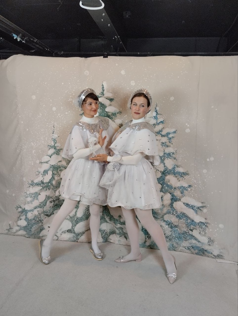 А это, сами понимаете, костюмы снежинок. Какие к ним могут быть требования? Легкость, невесомость, воздушность. Что-то вроде этого? Но мы-то знаем... И нам нужен неубиваемый костюм, на разные типы фигур, и чтобы папы - глазками так - тыгдык! (это не основное требование, но в праздник ведь надо всех порадовать, даже пап, которых выгнали с детьми из дома на спектакль, чтоб не путались под ногами и не мешали строгать оливье). Тонкие ткани - мелкая сетка, вуаль, органза - красиво. Но стоит один раз зацепиться, да хотя бы ногтем - кирдык костюму! Мишура? Пошло. Рискнула и заказала неопреновую сетку. На фото все выглядело супер. Но когда развернула присланный рулон - ужаснулась. Выглядит грубо, толсто. Поплакала (нет, конечно) и взялась за работу. Задачу - чтобы хорошо смотрелось на любой фигуре - решила просто. Юбочка на запахе. Юбку сделала разноуровневую, чтобы облегчить образ. Подъюбник из трикотажа - масло на резинке. Сначала хотела оставить просто резаный край, но выглядело довольно