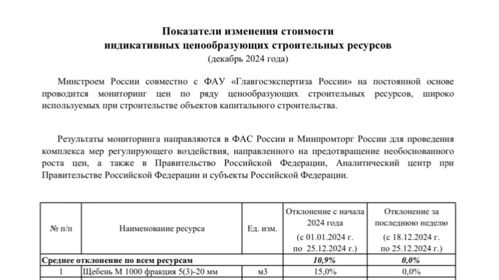 Изменения стоимости ценообразующих строительных материалов за декабрь 2024 года