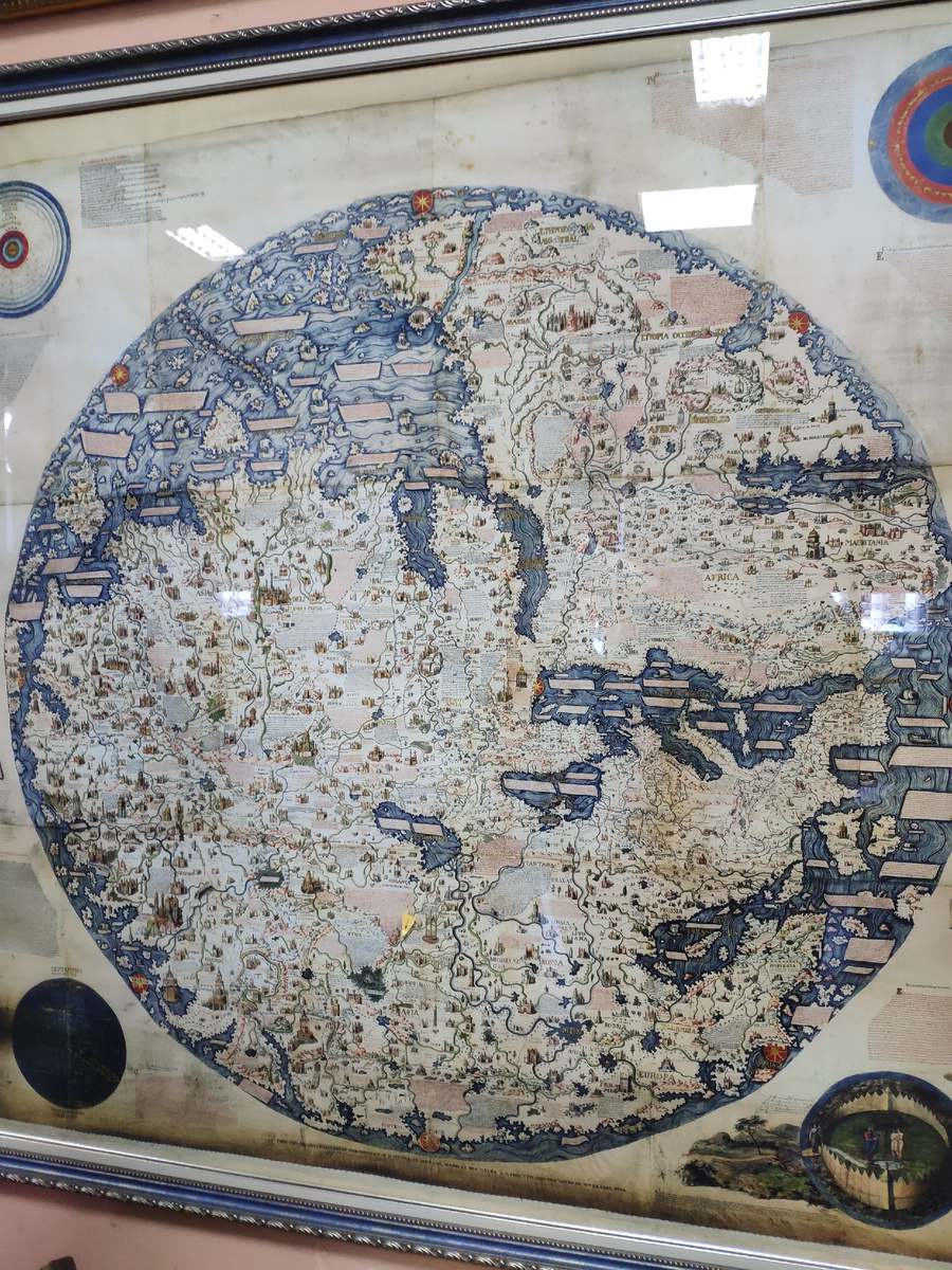 Очень инетерная карта мира. И на ней указана Вятка (жёлтая бумажная стрелочка). Карта "перевёрнутая" по сравнению с современными. Внизу на карте Евразия - а наверху Африка. Европа внизу-справа. Там хорошо виден итальянский сапожок (носком кверху).