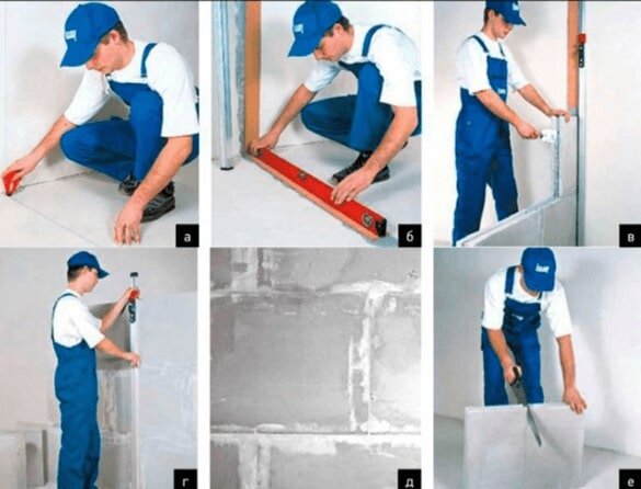 В местах установки плит делается четкая разметка с помощью шнура и лазерного уровня. Нужно учитывать, что согласно СП 55-103-2004 максимальная длина перегородки из пазогребневых плит не должна превышать 6 метров, а высота не более 3,6 метров. Если предусмотрены дверные проемы, их нужно отметить при разметке.