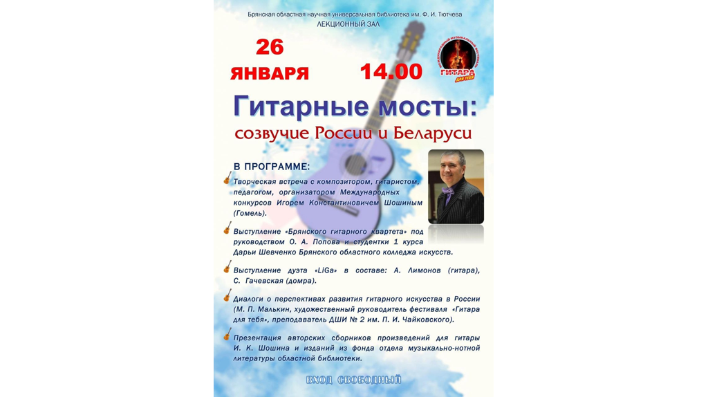 Концерт-дискуссия, творческая встреча с композитором, гитаристом, педагогом, организатором международных конкурсов Игорем Константиновичем Шошиным (Гомель) пройдет в Брянске. Встреча состоится 26 января в Брянской областной научной универсальной библиотеке им. Ф. И. Тютчева. Начало в 14:00. Игорь Шошин родился в городе Гомеле, обучался по классу гитары у гитариста и педагога В.И. Киселёва, затем в Гомельском государственном колледже искусств им. Н. Ф. Соколовского, окончил Белорусский государственный университет культуры и искусств. Музыка Игоря Шошина широко известна, звучит на радио и телевидении, её включают в свой репертуар различные исполнители и музыкальные коллективы России, Беларуси и зарубежных стран. В концерте примут участие гитаристы Беларуси и Брянщины. А также брянские композиторы, аранжировщики, преподаватели и учащиеся ДШИ. 6+ «Гитарные мосты: созвучие России и Беларуси»: концерт-дискуссия пройдет в Брянске