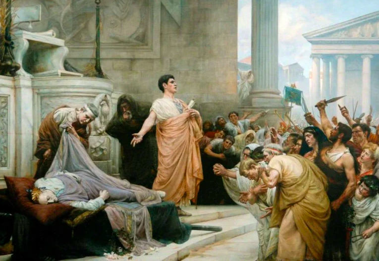 Когда на платформу было вынесено тело диктатора, среди собравшихся квиритов поднялся плач. Прощальную речь должен был произнести Марк Антоний, но вместо того, чтобы отрезвить толпу, успокоить её, он решил ещё больше разжечь настроения граждан против убийц Цезаря.
