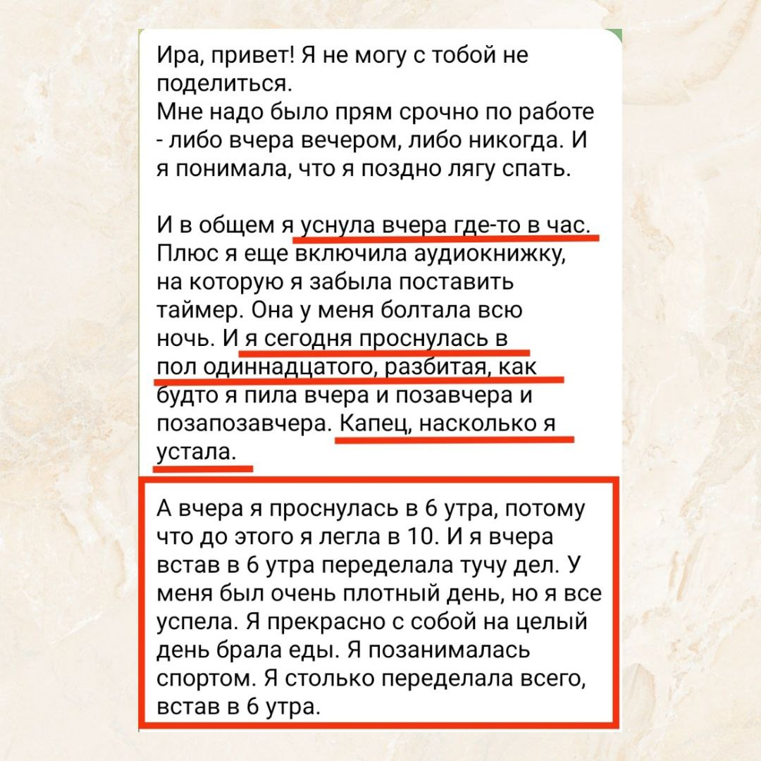 Ты устаешь не потому, что много работаешь. Ты устаешь потому, что не вовремя ложишься спать. ☝🏻 инсайт клиента Да, вероятно есть исключения из этого правила и кому-то комфортно и хорошо работается при ночной жизни. 😉 Но это не точно. Потому что приспособиться тело может ко всему. У него такая цель - выживание. А вот как именно поменяются метаболические пути и к чему это приведет спустя десятилетия ночной жизни - это вопрос открытый. Еще инсайт 👇🏻 и сразу хочется чего-то такого - жареного, сладкого И все эти тяги также будут зависеть от сна. Мелатонин контролирует и дневную жизнь, несмотря на то, что это ночной гормон. Настроение, состояние микробиома - тоже в большой части его работа. Очень круто, когда девочки на практике чувствуют то, о чем я говорю! Этот перепад - 😀 когда вовремя поспал и всё успел, 😩 и на следующий день сразу когда лег не вовремя и ты сосиска - это очень наглядно и действенно. я сегодня проснулась в пол одиннадцатого, разбитая, как будто я пила вчера и позавч