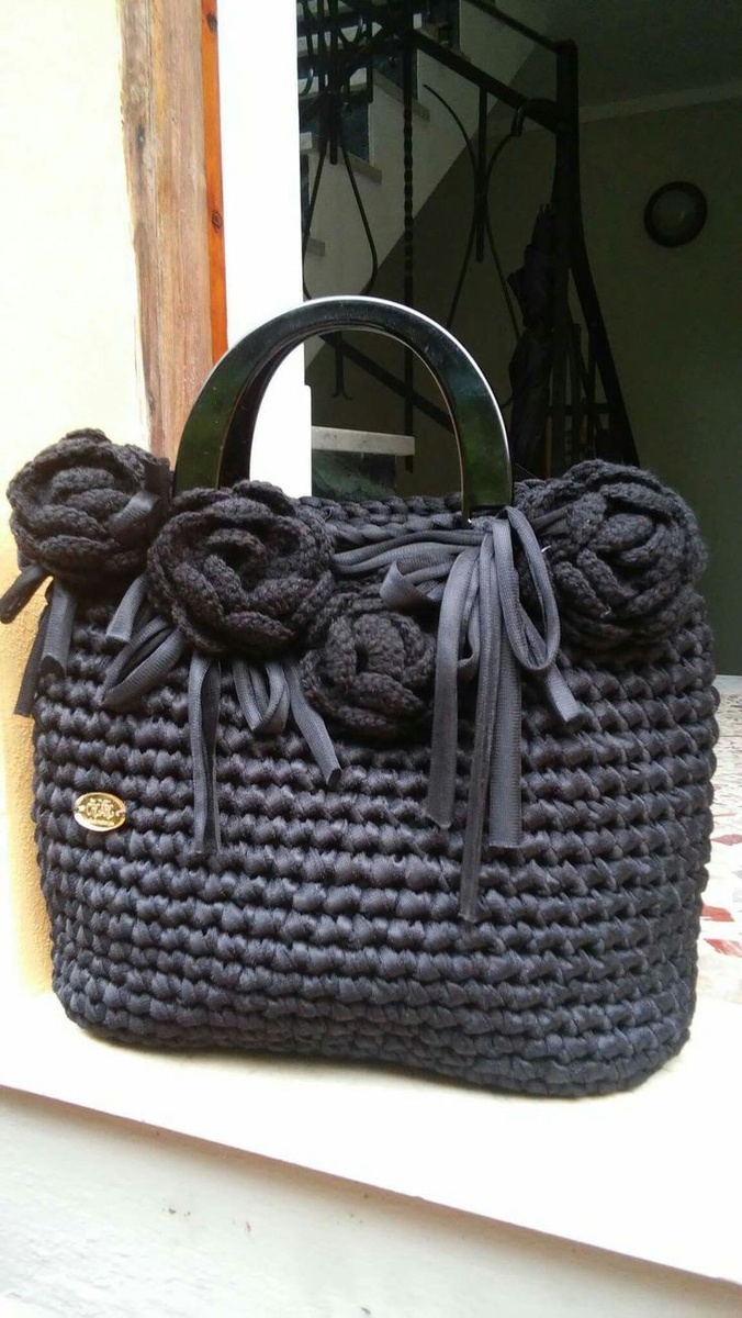 Черная плетёнка с вязанными розами. Розы созданы с помощью крючка. Эта не новинка, да и модель старомодна, но глаз ципляет. Такая модель подойдёт для ежедневной носки. Также можно добавить длинную ручку для удобного использования 👜