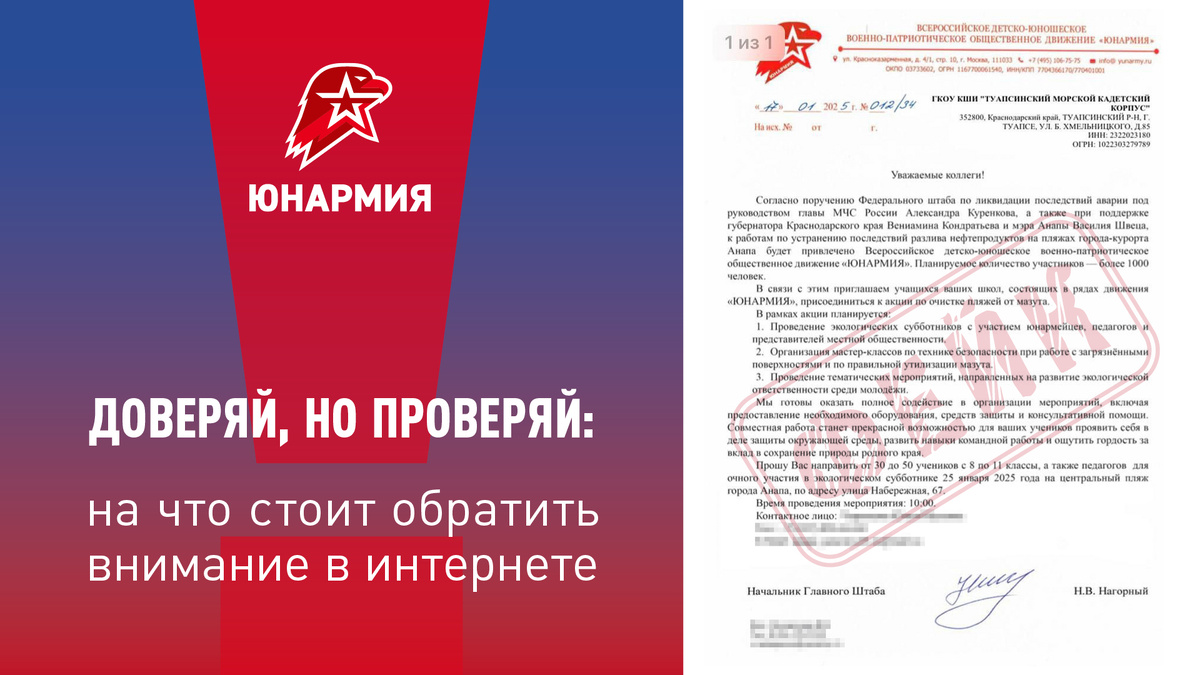 Электронный документооборот ― незаменимый ресурс в работе, который не обошли вниманием кибер-преступники. Цели разные: от обмана до провокаций, но суть одна, чтобы пользователь попался на крючок. В ход идут все более изощренные приемы и уловки. Рассказываем, как распознать виды онлайн-мошенничества. Один из таких – фишинг. Мошенники, с целью украсть личную информацию, отправляют электронные письма или сообщения, содержащие вредоносное ПО, чтобы пользователь перешел на поддельный веб-сайт очень похожий, например, на портал Госуслуг. Но бывают письма, авторы которых преследуют более глобальную цель ― вывести из состояния равновесия, посеять панику или дискредитировать. Недавно в образовательные организации Анапы поступило письмо якобы от Начальника Главного Штаба Движения «ЮНАРМИЯ» с просьбой привлечь юнармейцев к уборке мазута на пляжах города. Письмо на официальном бланке выглядело убедительным, но есть одно НО, документ – фейк. 1. Чья подпись стоит на документе. В нашем случае стояла