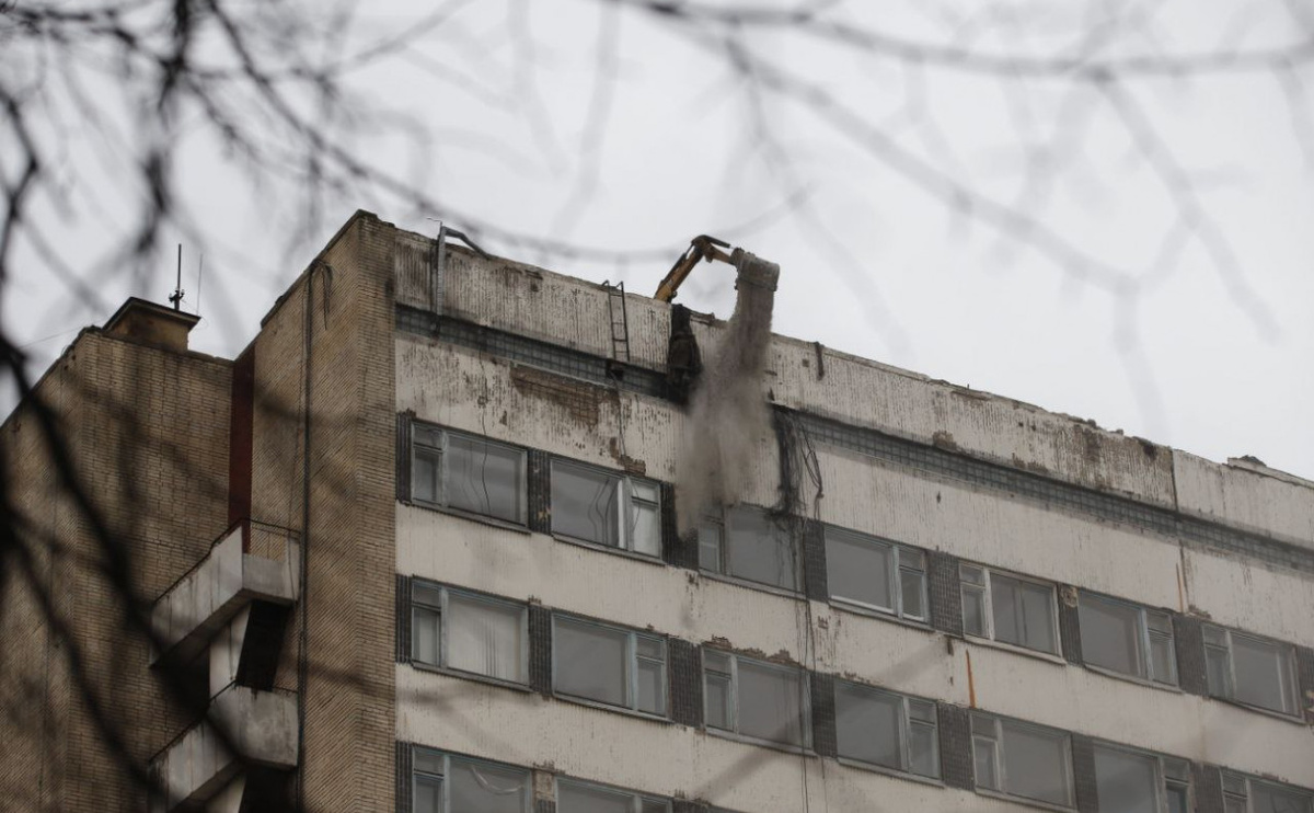 Снос опустевших офисных помещений, где располагался культурный центр «Типография», Concert Hall и множество других организаций, начался сегодня. Пока на крыше работает только экскаватор.