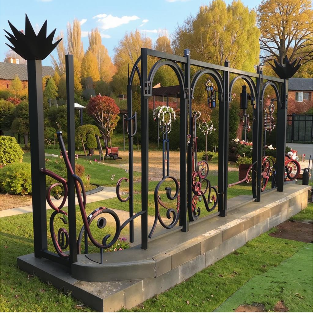 Ограды и заборы Кованые ограды могут быть как функциональными (защита территории), так и декоративными элементами. Они придают участку изысканный вид и подчеркивают стиль владения. Часто такие ограждения украшаются растительными орнаментами, виноградной лозой или абстрактными узорами.