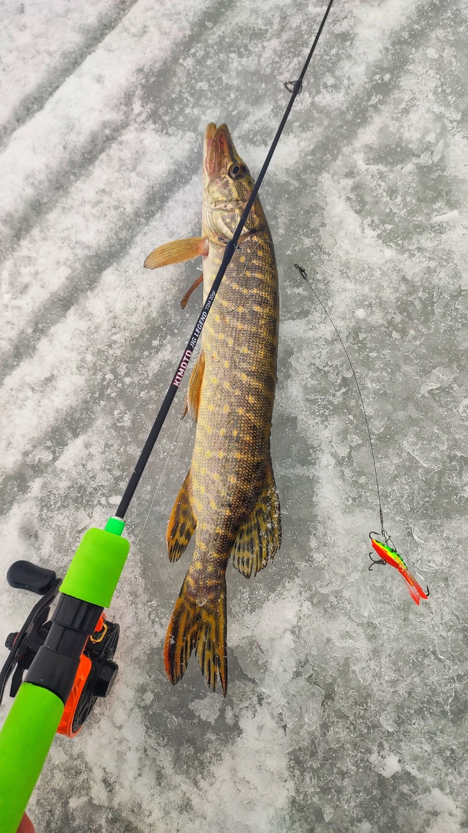 После дождливой оттепели у нас второй день небольшой мороз -3° градуса. Было принято решение ехать на рыбалку. Прибыл на водоём в начале девятого. Рыбаков было уже прилично. Быстренько расставил жерлички и приступил к тесту своего нового удилища Kimoto Jig Legend 72M 20gr. Хорошая палочка, бюджетная. Выпускается в трёх длинах: 60, 67 и 72 мм. А также в разных весах. Первая поклёвка произошла в 10:30. Такой себе клёв. Жерлицы тоже молчали. В моей видимости жерлиц 40 было. И ни у кого загара я не видел. В 12:40 решил плюнуть на жерлицы и ушёл в другое место, метров за восемьсот. Правда, лëд там тонковат. Всего 5 см, но зато рыбу нашёл! Щука клюнула на первой же проводке. Вот только фрикцион у меня оказался расслаблен. Но ничего, вытащил! Ну, хорошая такая килошка. Удочка отработала. Через 4 лунки наткнулся на окуня. Собственно, за кем я и езжу. Хороший клюнул. После него было ещё три поклёвки в этой же лунке. Одна за другой. Обурил вокруг и начал его выдразнивать. В результате кл