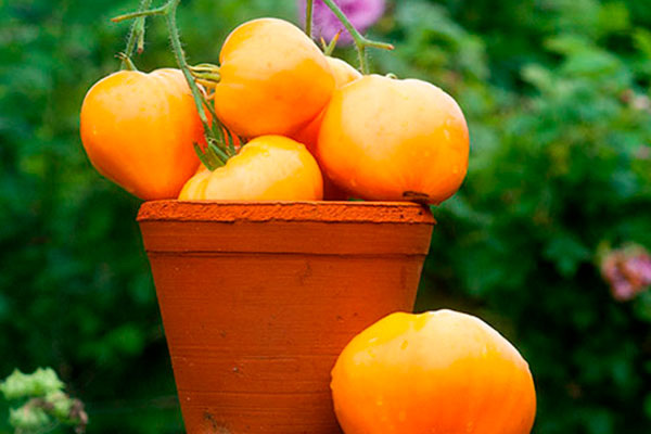 - Сортовые помидоры окрашены в насыщенный оранжевый цвет и имеют сердцевидную форму. Их размеры варьируются: от сравнительно небольших 200 г до внушительных 650 г. Но самые крупные экземпляры обычно собирают с первых кистей.